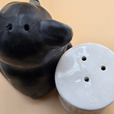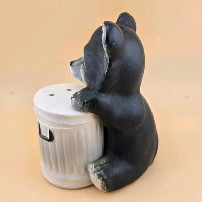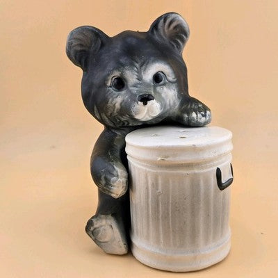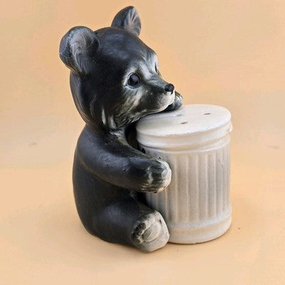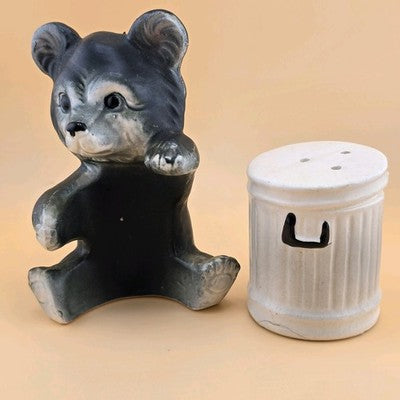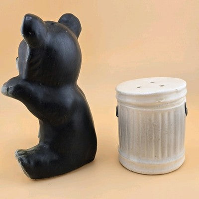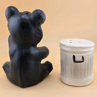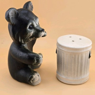 Add vintage charm to your table with this Black Bear and Trash Can Salt & Pepper Shaker set. Made in Japan, these chalkware ceramic shakers come with plastic stoppers and feature a playful, collectible design.
