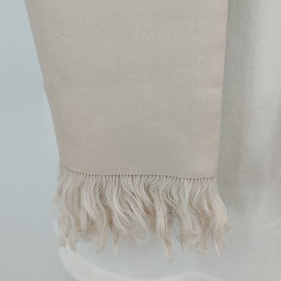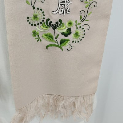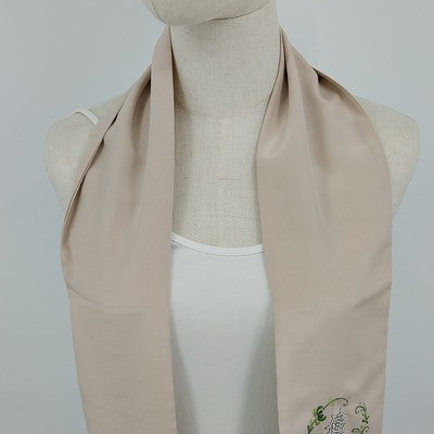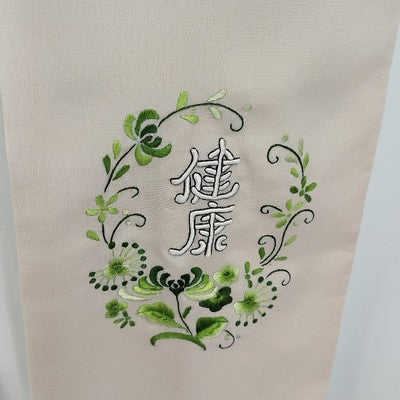 Add elegance and meaning to your accessory collection with this beige silk scarf, beautifully embroidered with delicate floral designs and Chinese lettering symbolizing "health." The soft sheen of silk and fringed edges make this piece both luxurious and unique.