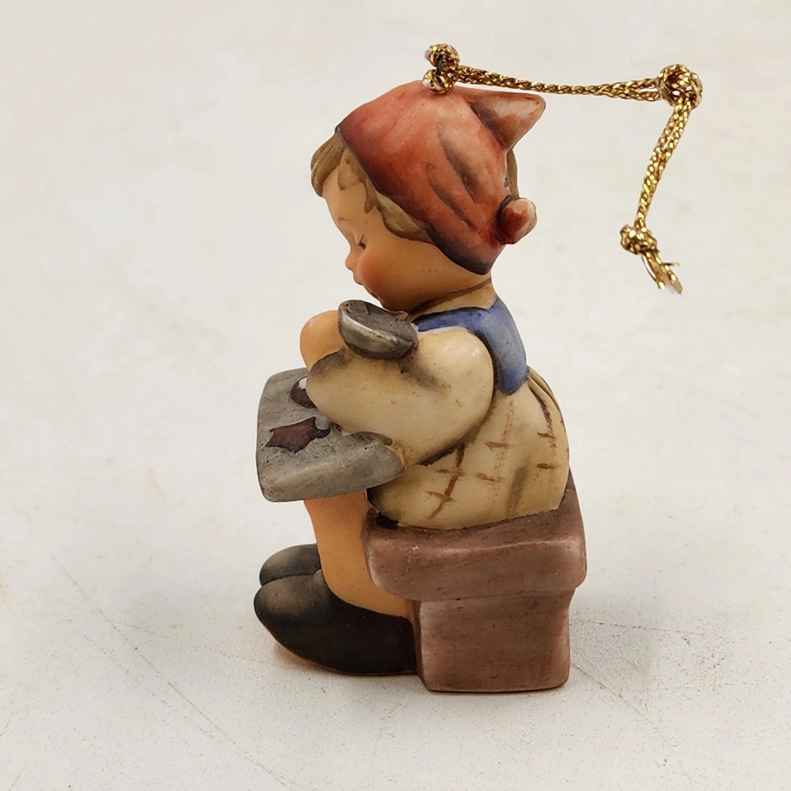 The ornament depicts a young boy sitting, seemingly focused on his holiday cookie preparations. These hand-painted ceramic or porcelain pieces are a beloved holiday tradition for many collectors.