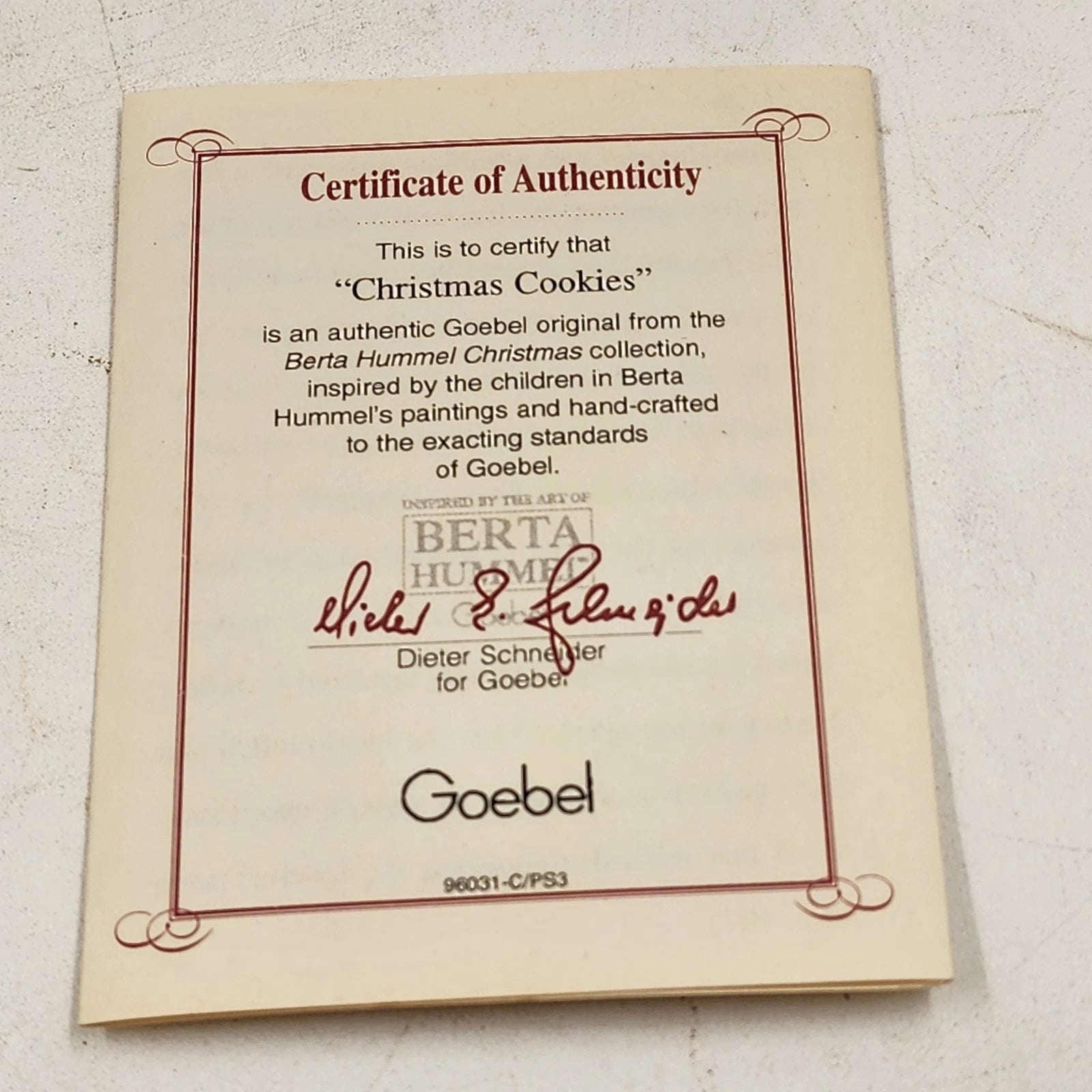 This adorable collectible is the "Christmas Cookies" ornament (Style BH-46), a charming piece from the "A Berta Hummel Christmas" collection. Created by Goebel and based on the delightful drawings of Sister Maria Innocentia Hummel, this figurine captures the spirit of the holidays.