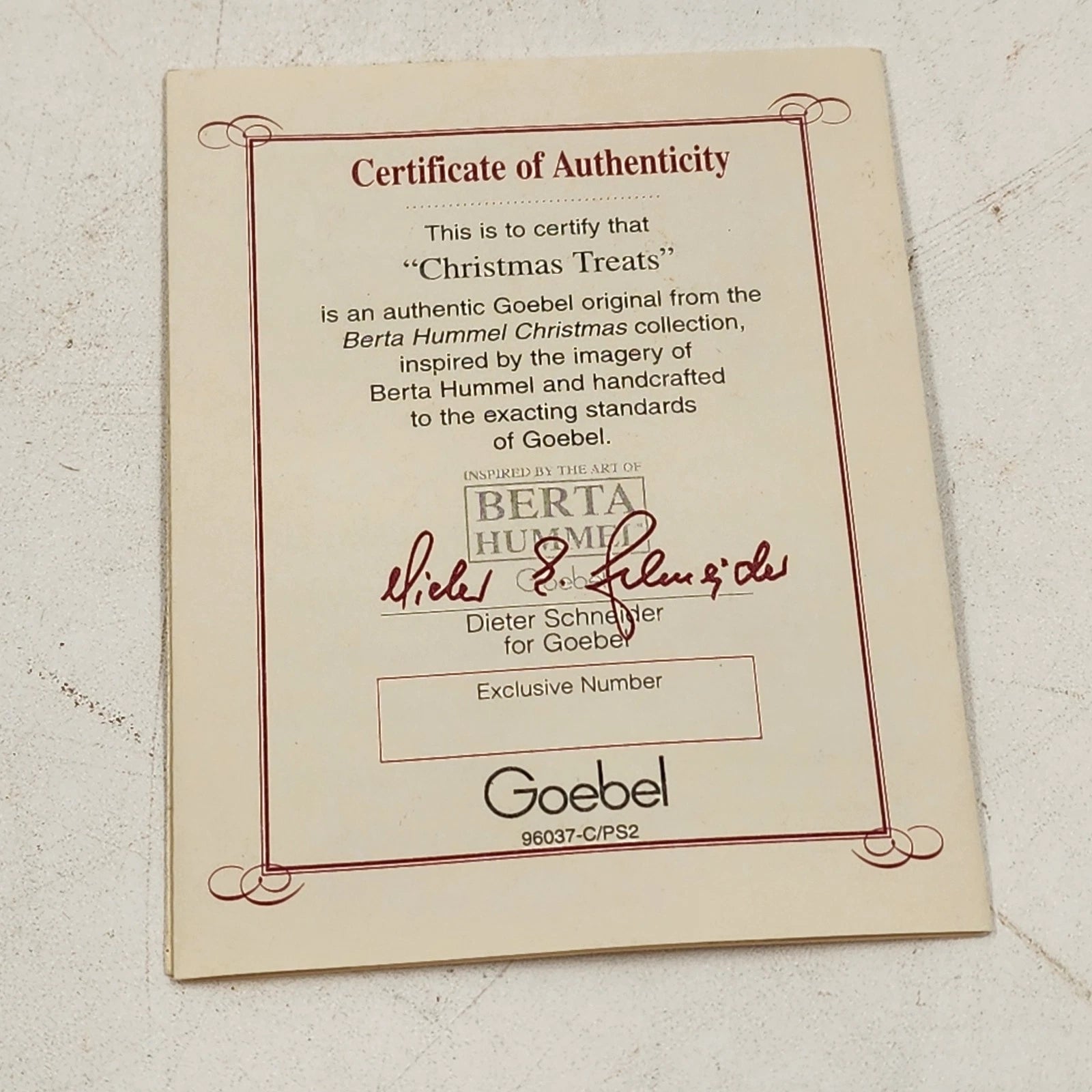 This adorable collectible ornament, "Christmas Treats," is a charming piece from the "A Berta Hummel Christmas" collection. Created by the German company Goebel, the figurine depicts a sweet scene of a young boy sharing a treat with his dog.