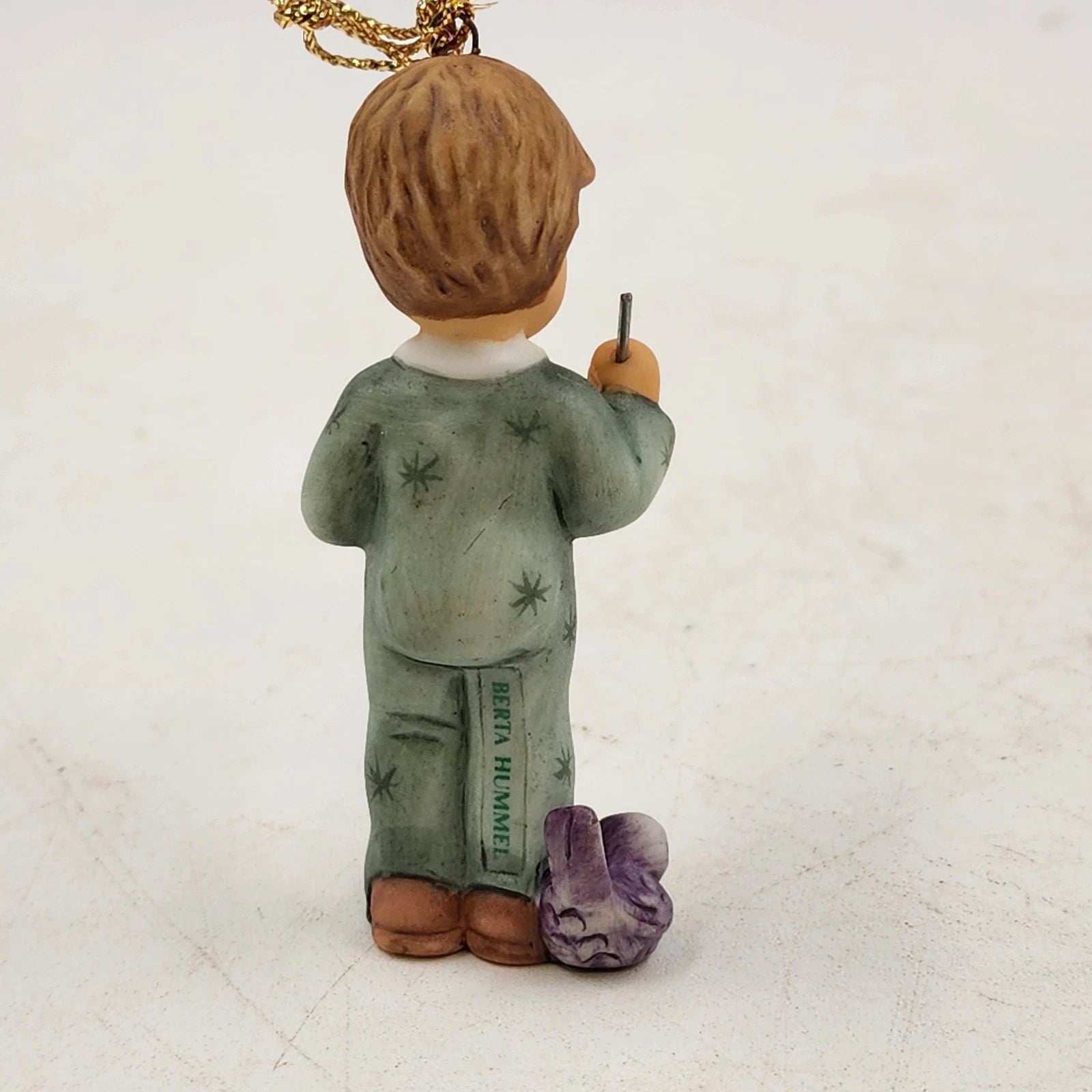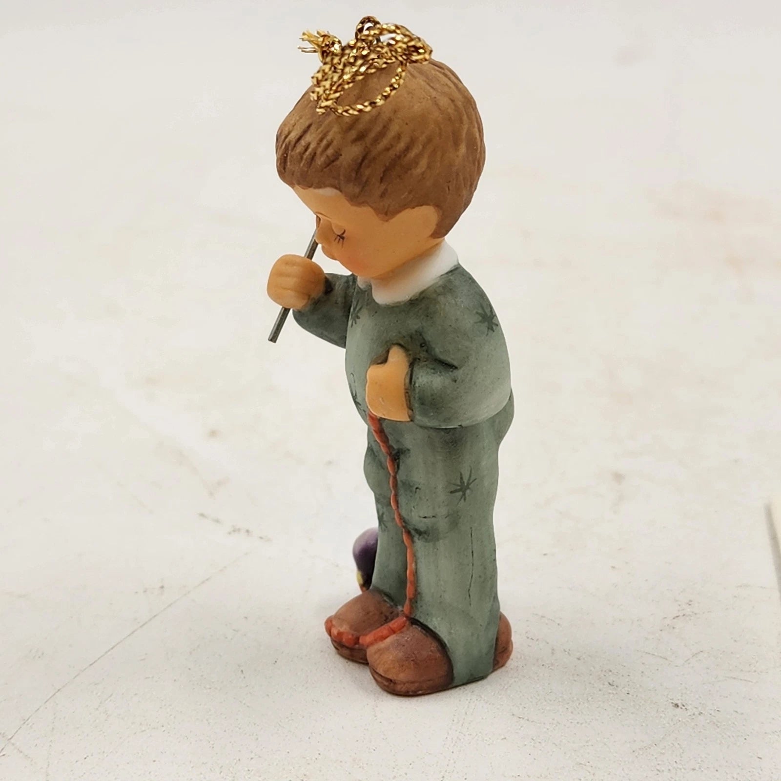 This precious collectible ornament, "Stringing Cranberries," is a highly sought-after and retired piece from the "A Berta Hummel Christmas" collection. Created by the German company Goebel, this miniature figurine beautifully captures a young boy focused on stringing a red garland.