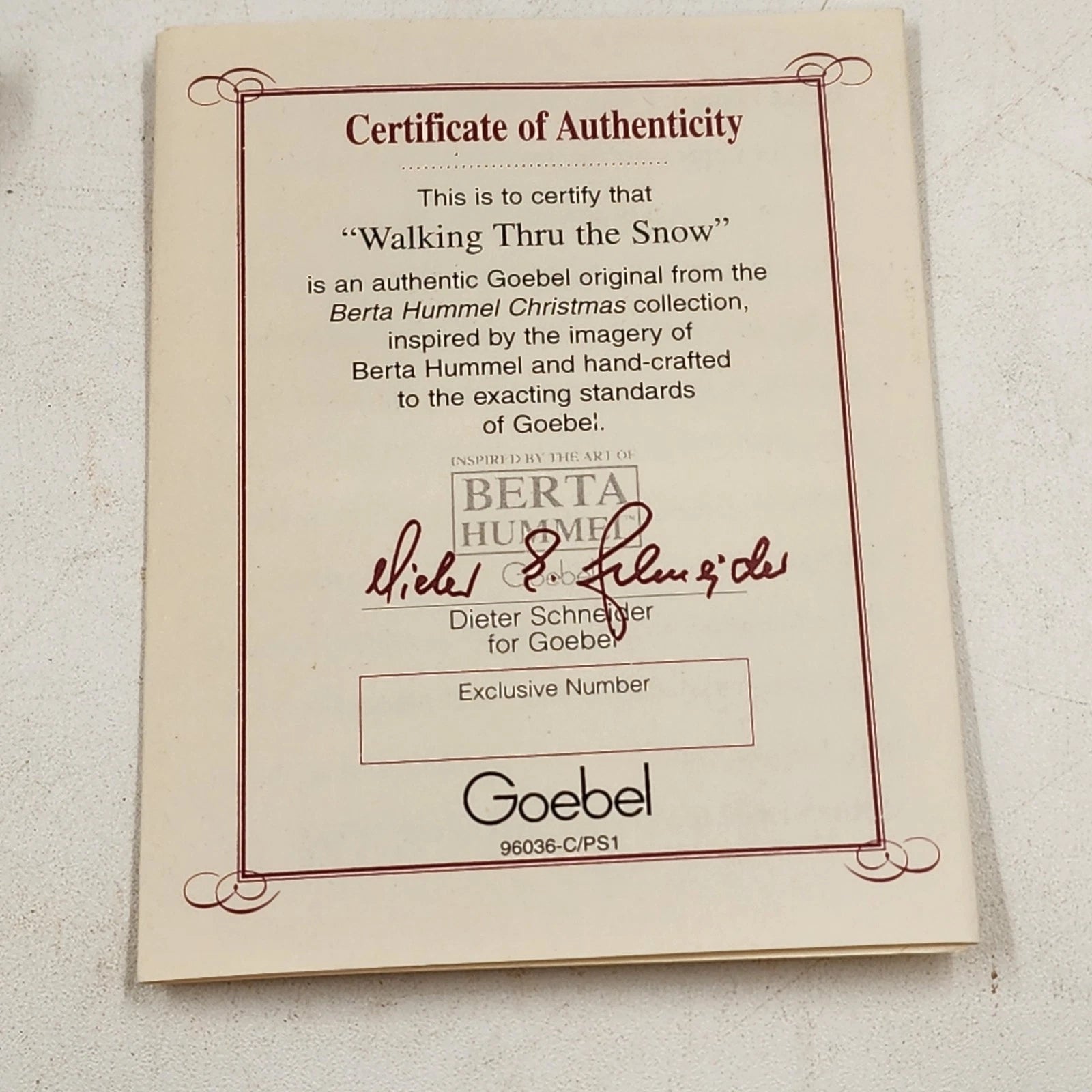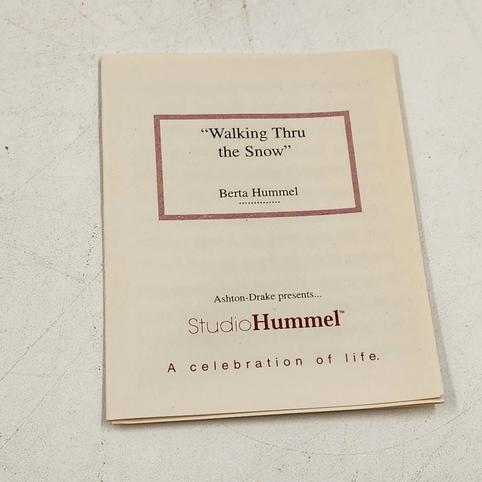 This lovely vintage Christmas ornament, "Walking Thru the Snow," is a highly collectible piece from the "A Berta Hummel Christmas" collection. Created by the German company Goebel, this ornament captures the innocence and warmth typical of Sister Maria Innocentia Hummel's art.