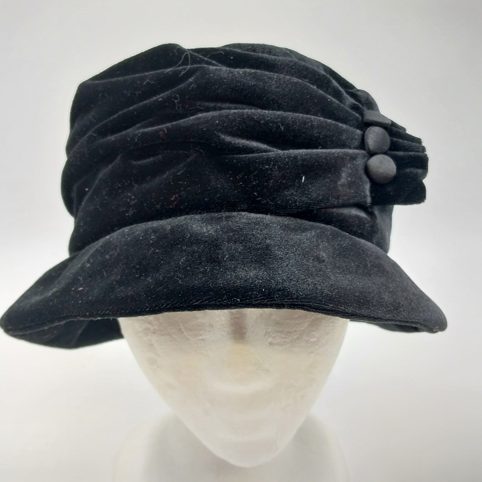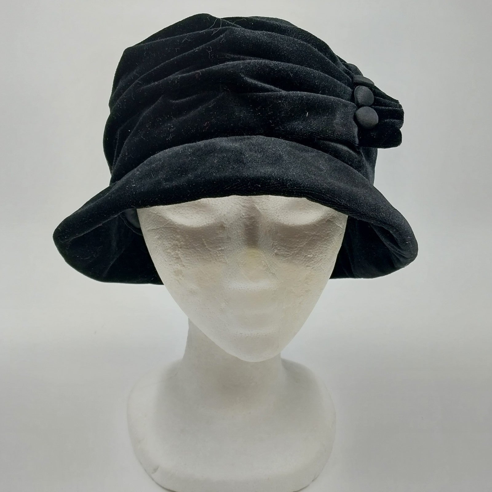 Step out in vintage elegance with this Betmar New York black cloche hat. Crafted from 100% polyester velvet, this timeless piece features a ruched design and three small satin buttons on the side. Fully lined for added comfort, it's both lightweight and packable, making it ideal for travel or daily wear.