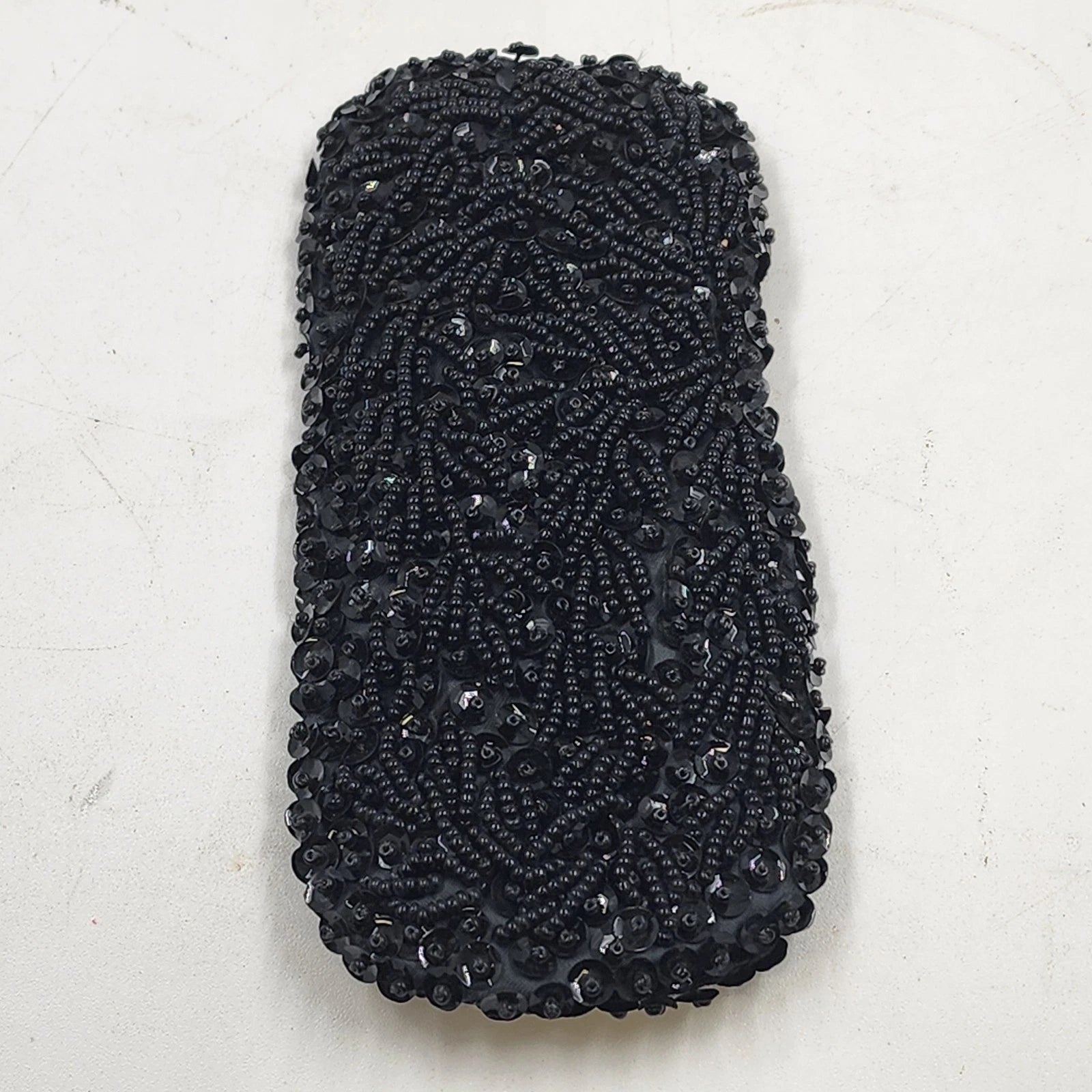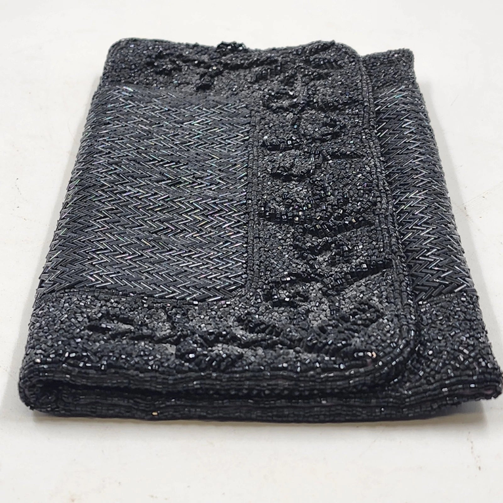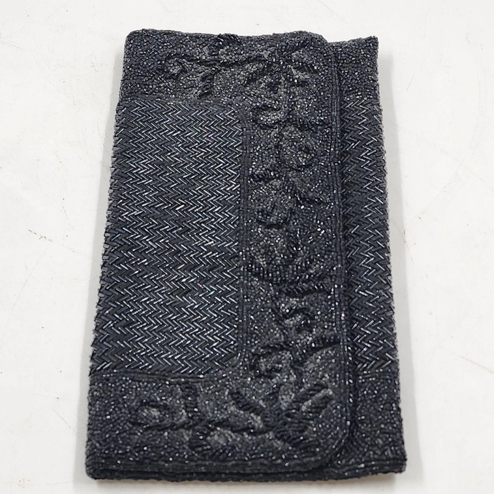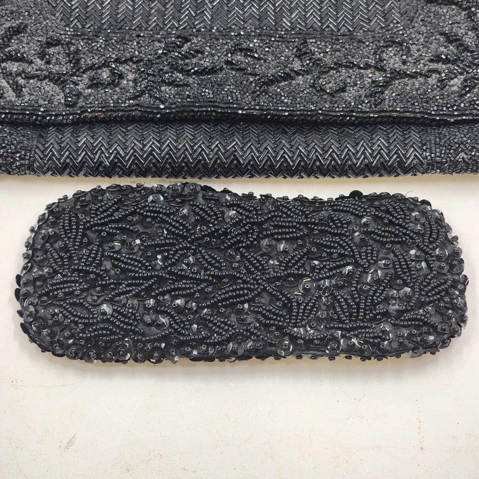 This elegant handmade black beaded clutch purse and matching eyeglass holder set features intricate bead and sequin work, perfect for formal occasions or evening events. The clutch showcases a detailed floral or leaf pattern on the flap, while the smaller pouch complements it with matching beadwork. Both pieces reflect vintage-inspired craftsmanship and timeless sophistication.