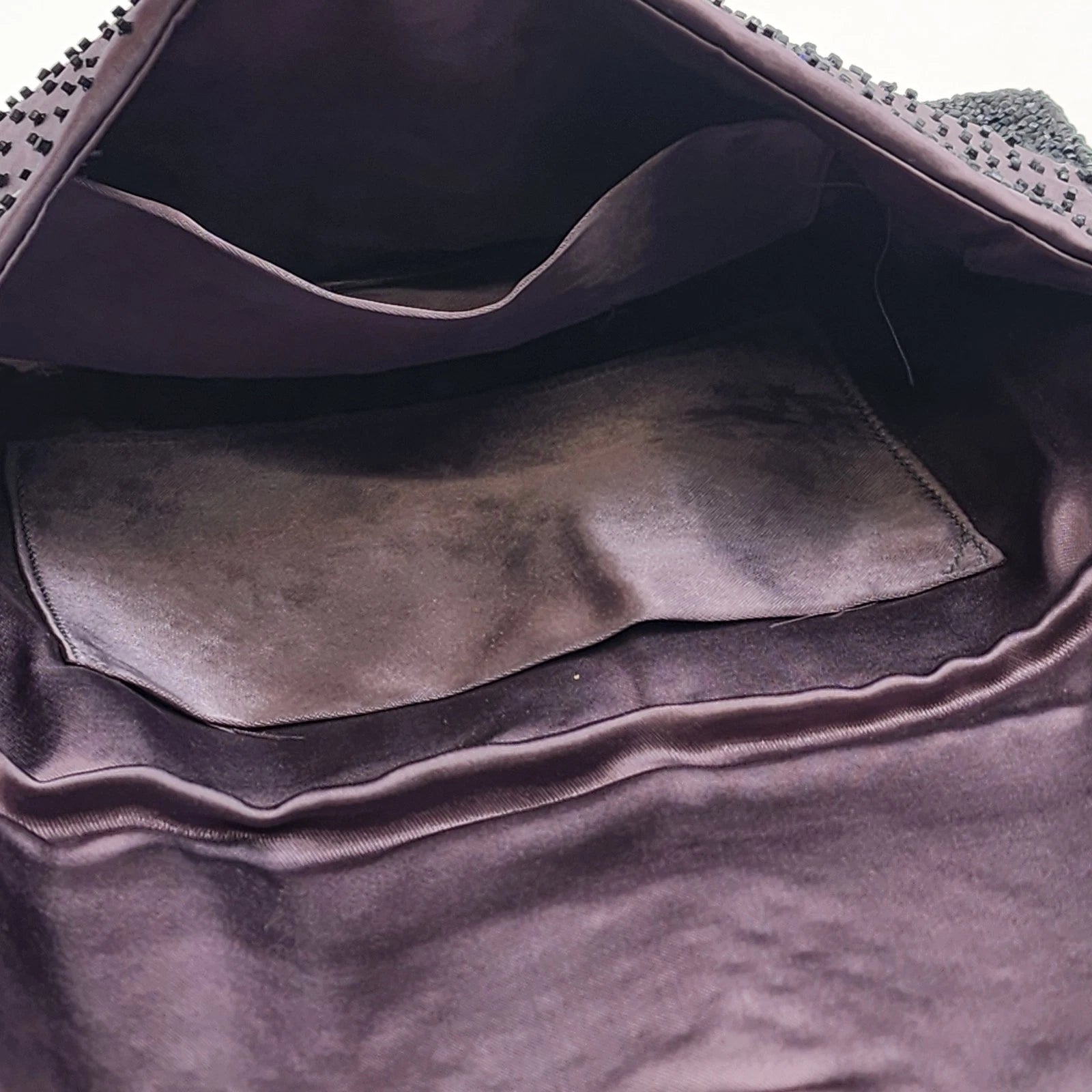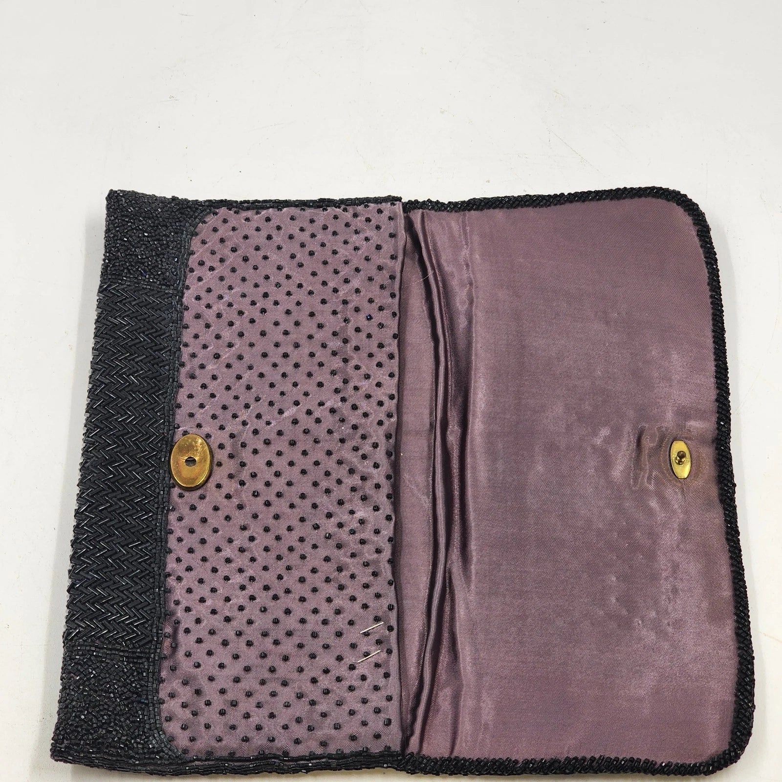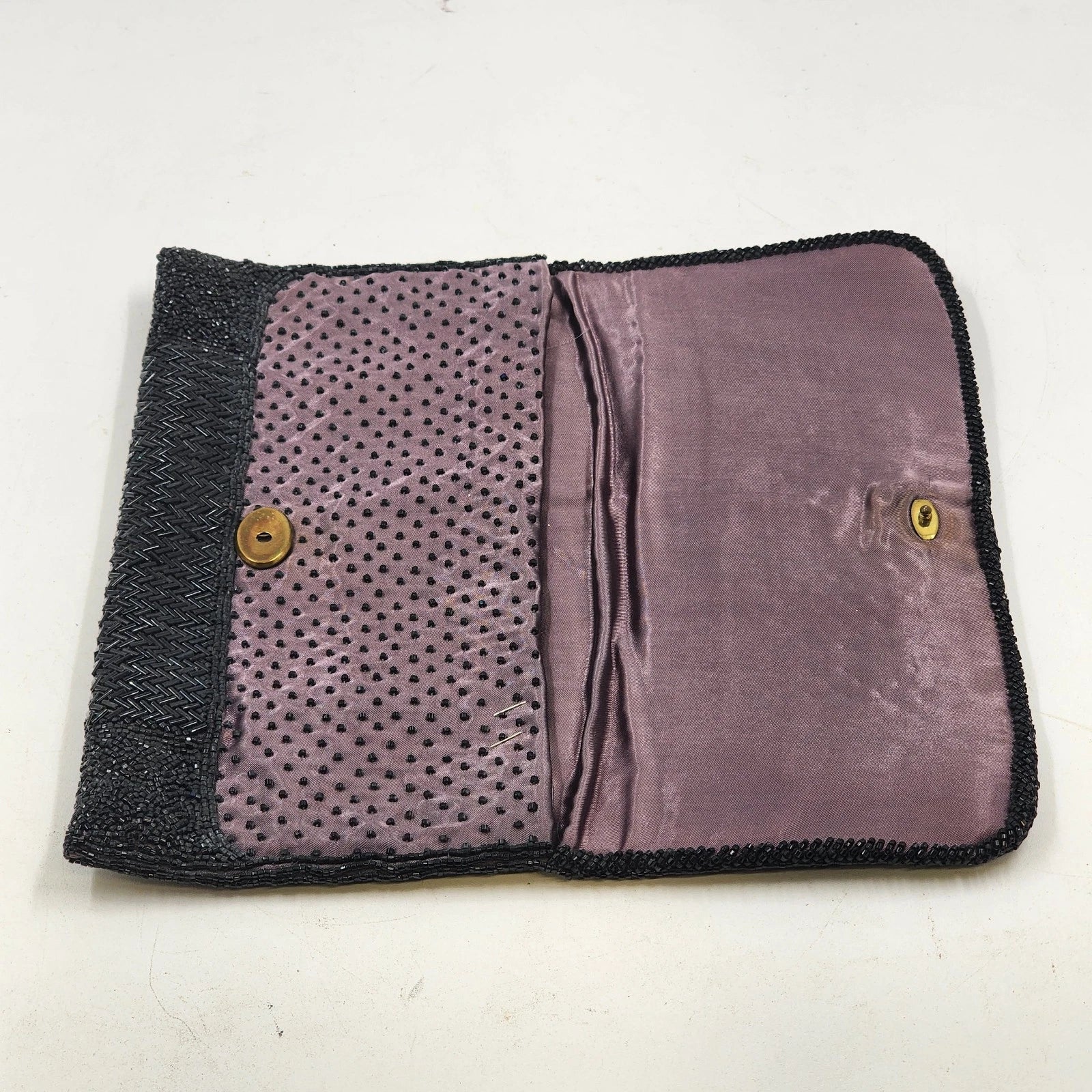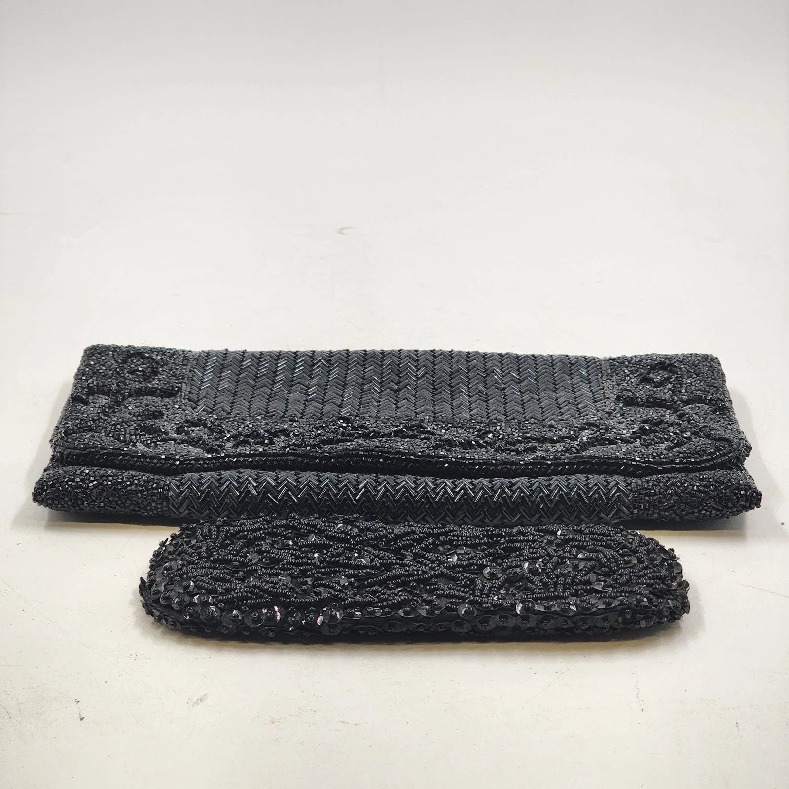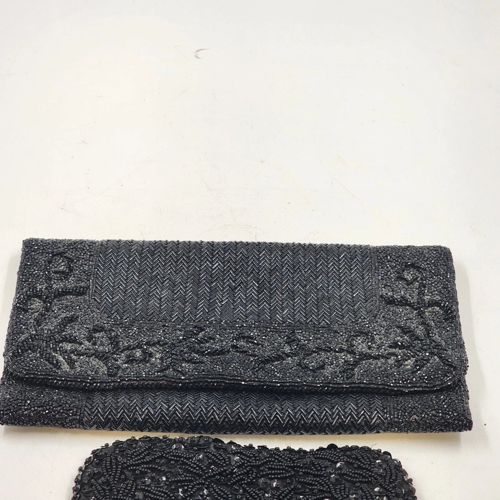 This elegant handmade black beaded clutch purse and matching eyeglass holder set features intricate bead and sequin work, perfect for formal occasions or evening events. The clutch showcases a detailed floral or leaf pattern on the flap, while the smaller pouch complements it with matching beadwork. Both pieces reflect vintage-inspired craftsmanship and timeless sophistication.
