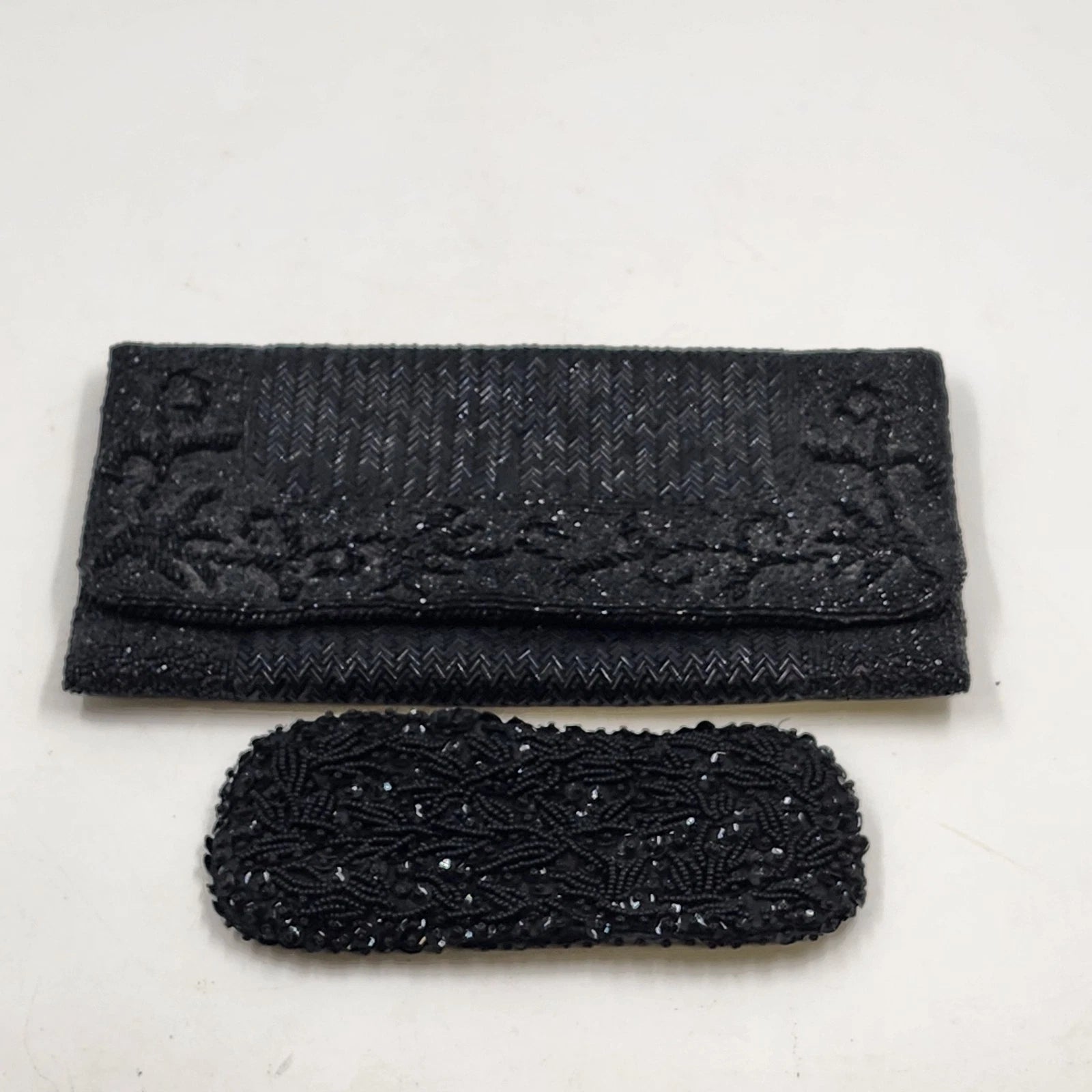 Black Beaded Clutch Purse Evening Set w Matching Eyeglass Holder Handmade Vtg