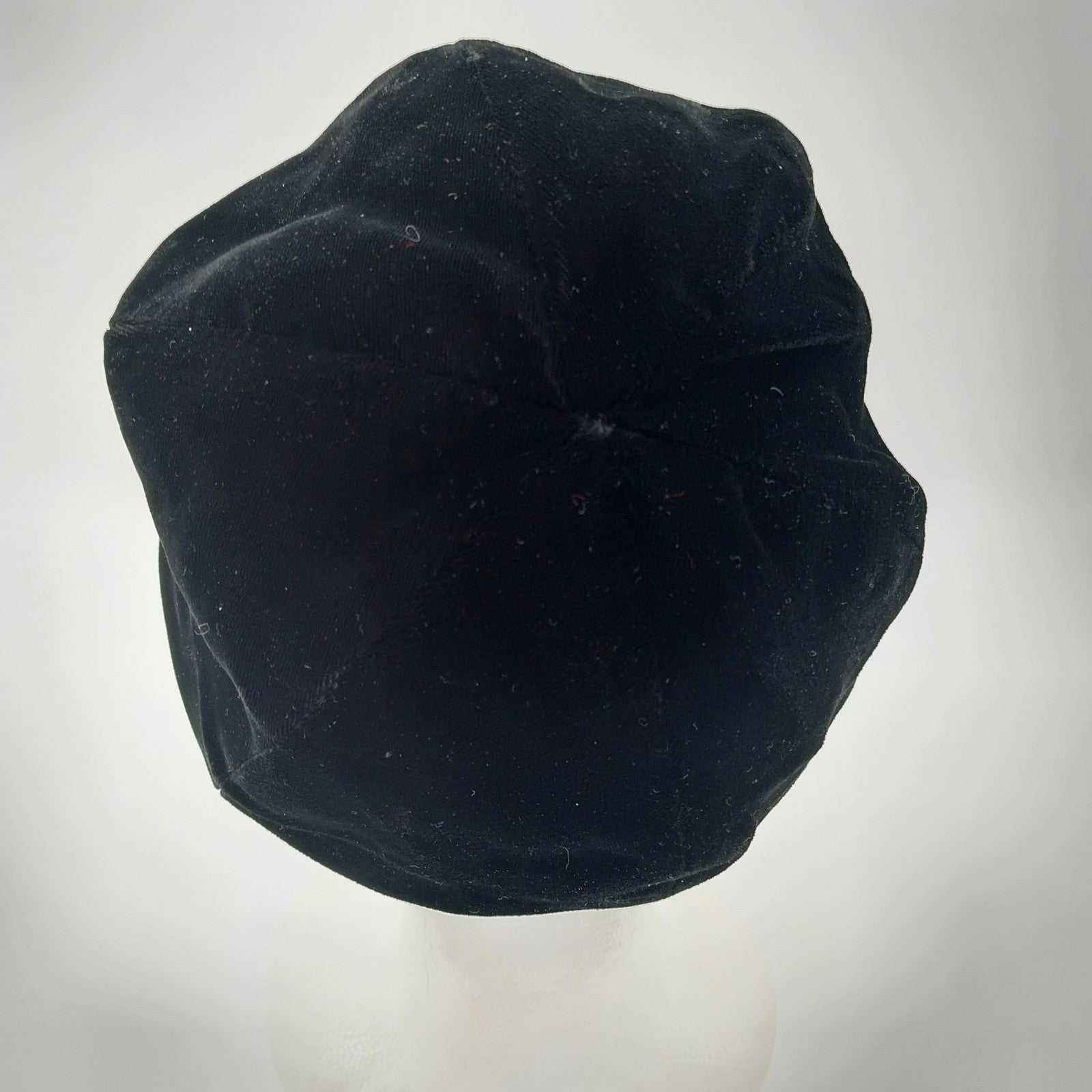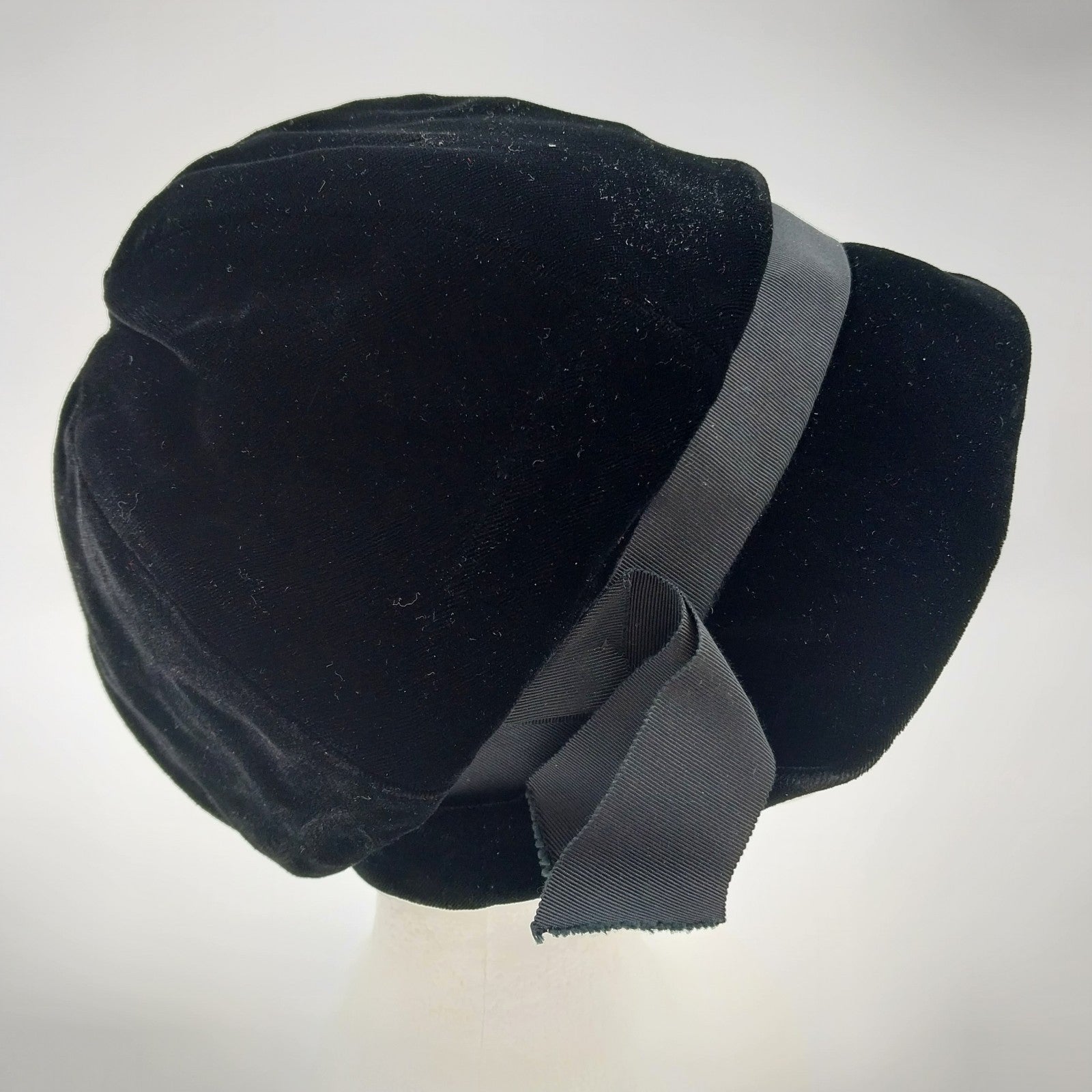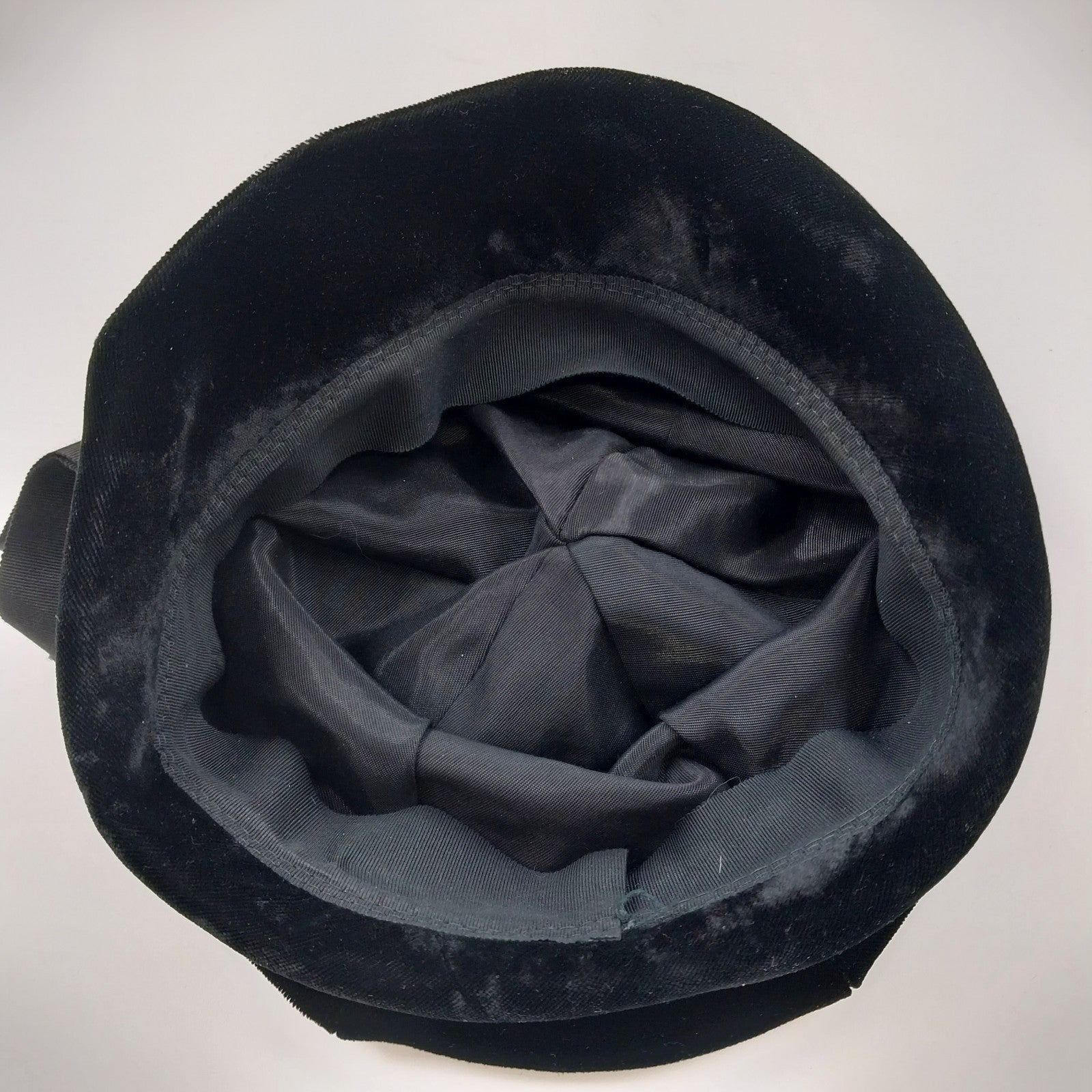 Vintage black velour cloche hat, exuding timeless elegance. Features a classic grosgrain ribbon bow band and a fully lined black polyester interior for added comfort.