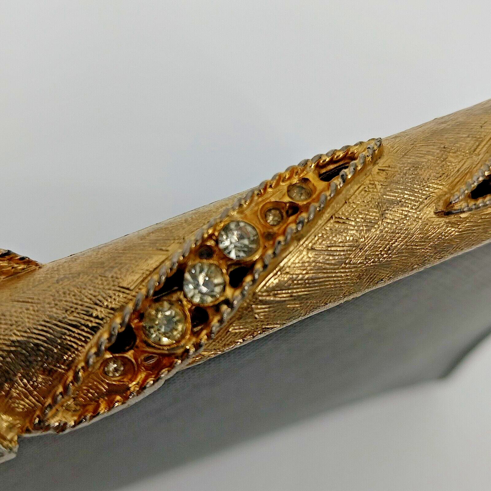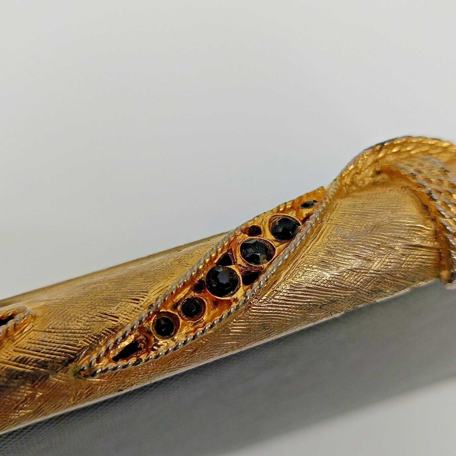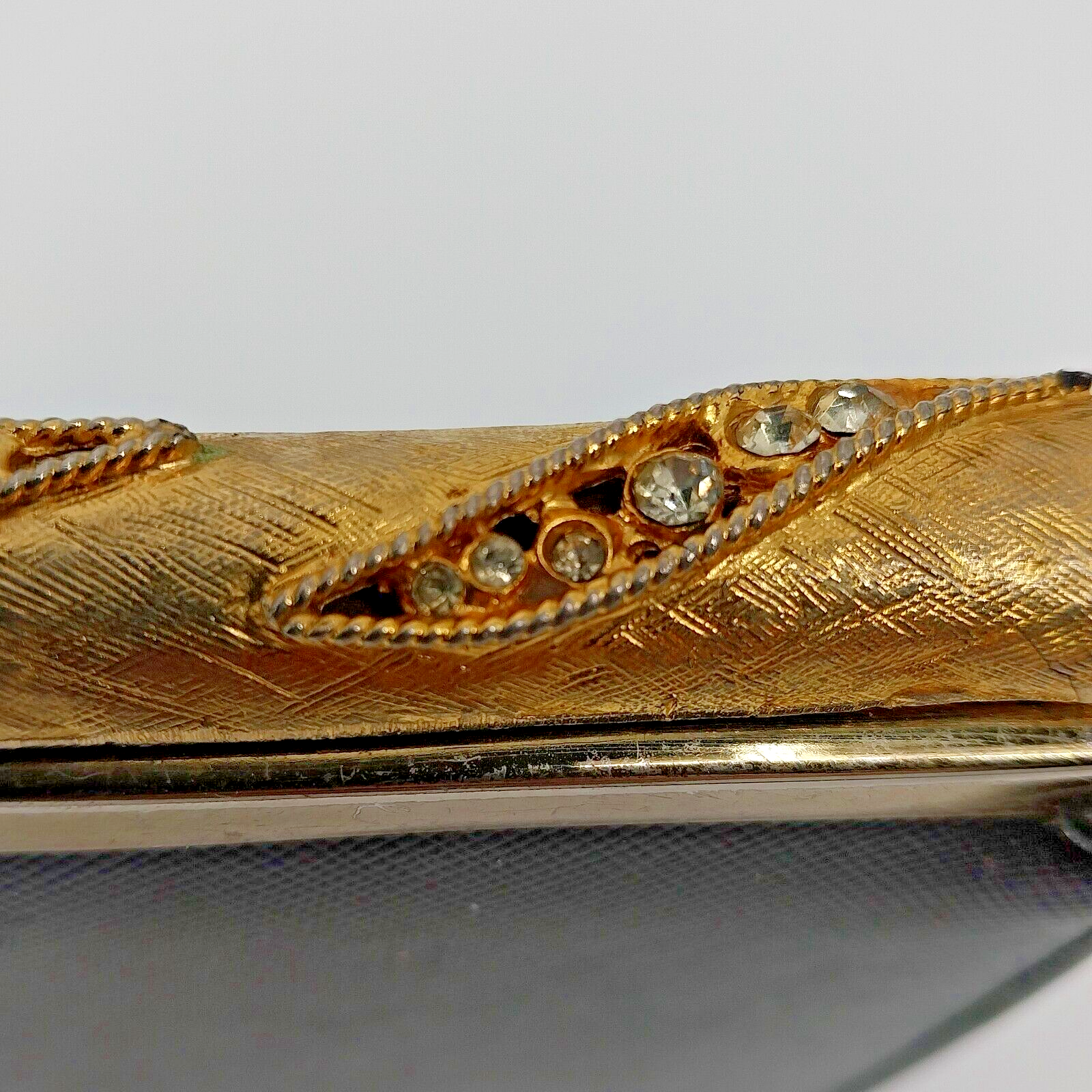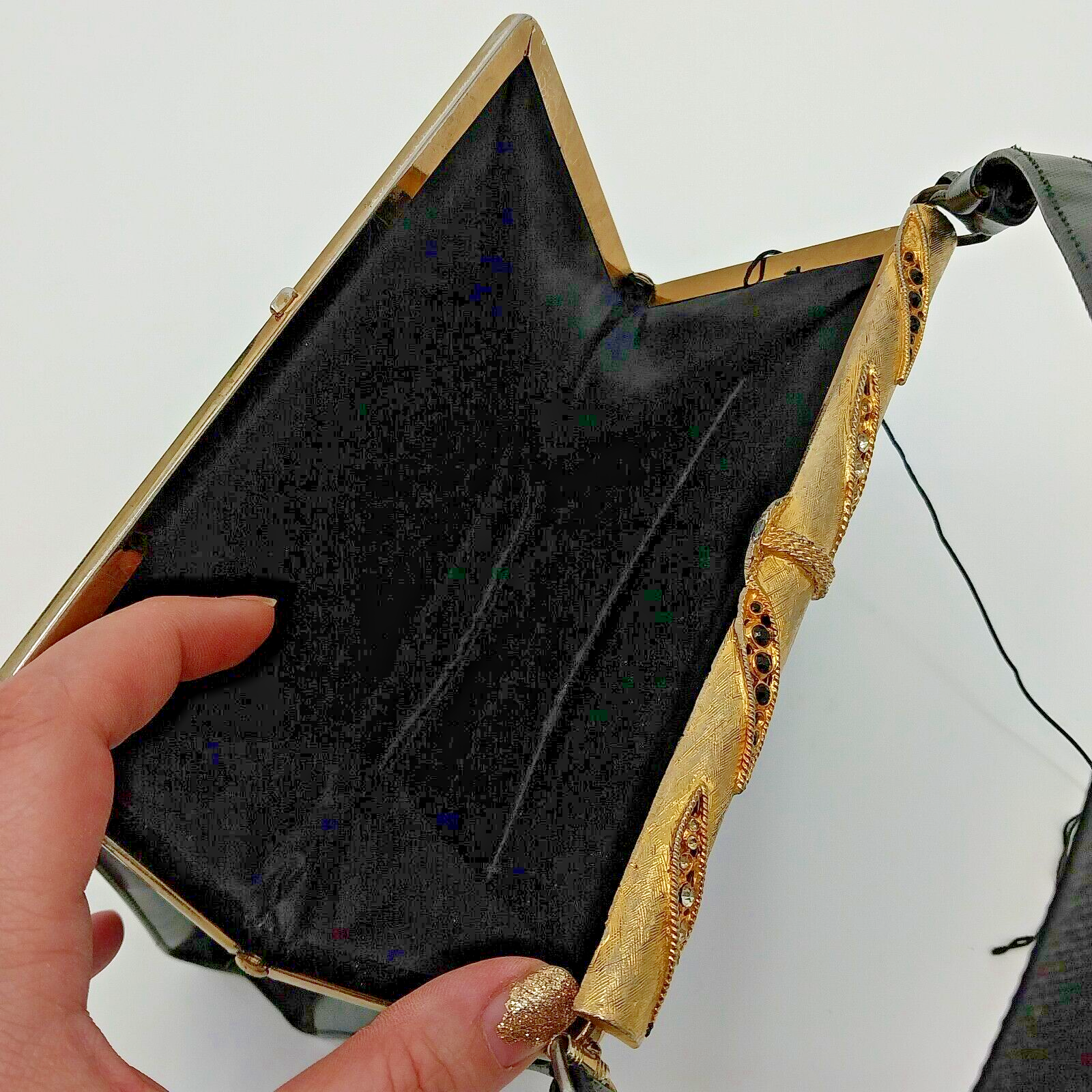 This is a vintage black handbag with a rhinestone metal clasp closure.