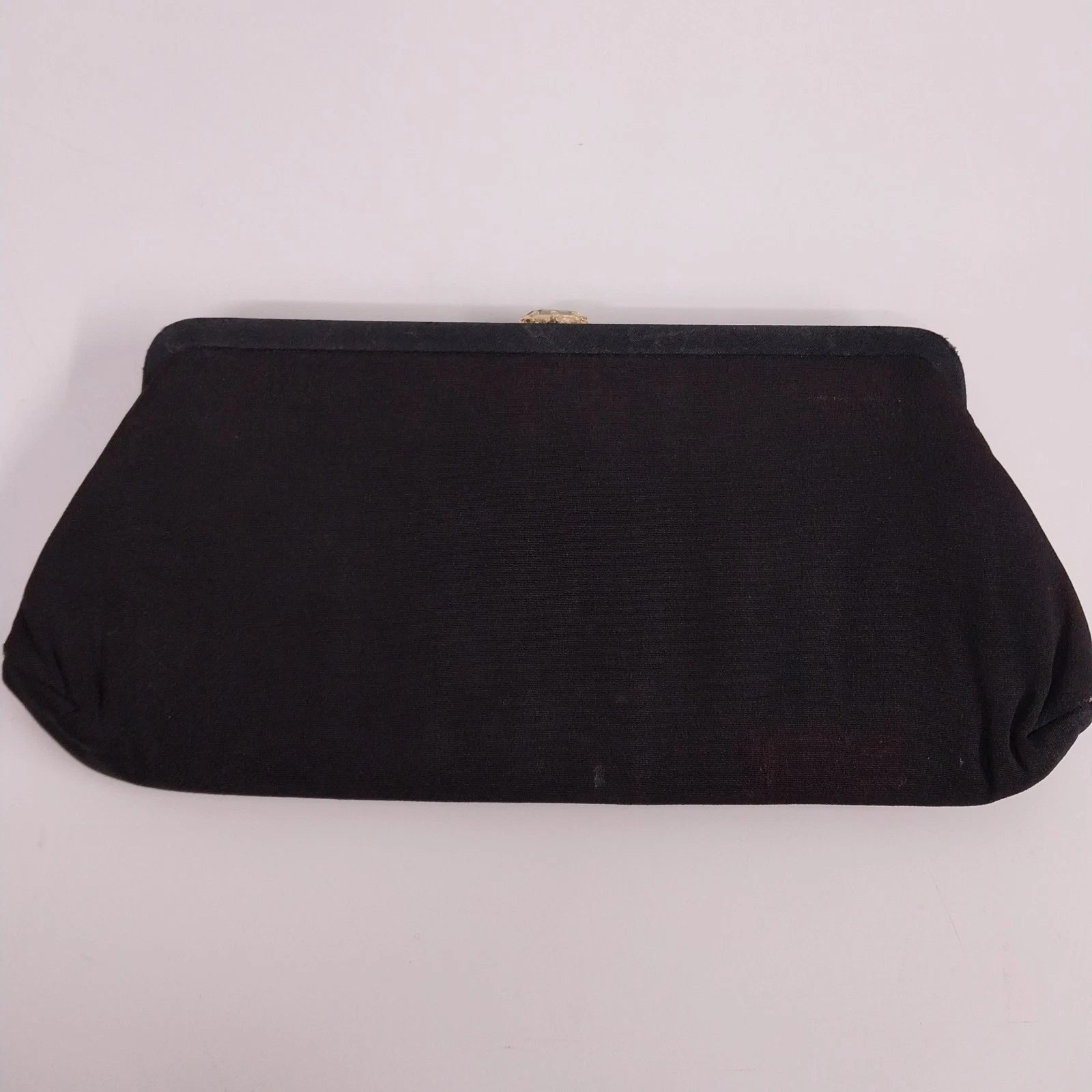 A classic vintage black clutch featuring a structured top and an elegant gold-tone clasp set with a faux stone.