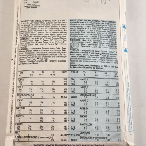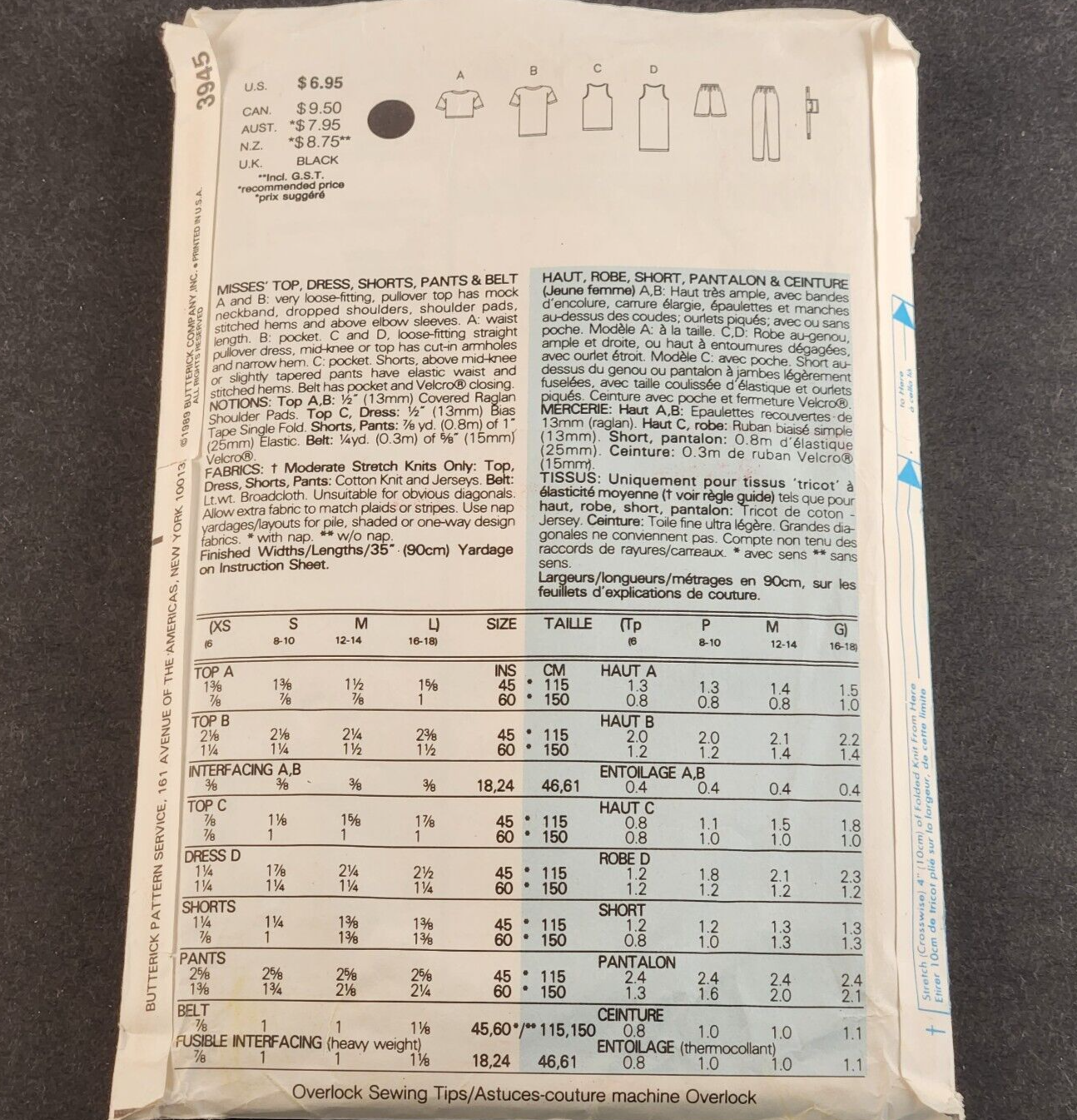 Butterick 3945 Vintage Sewing Pattern 1989 Misses Top Dress Shorts Pants Belt