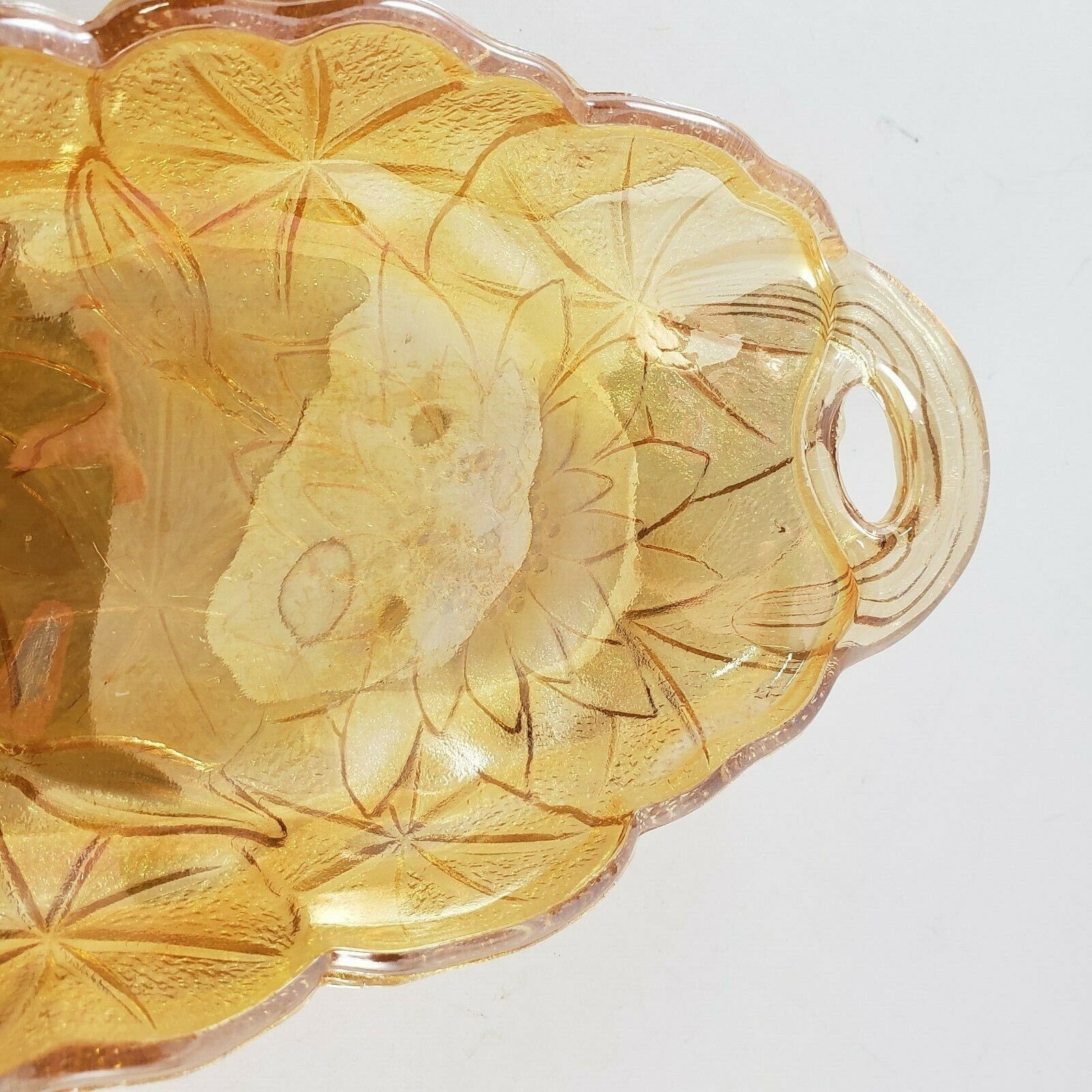 Carnival Glass Dish Oval Flower Marigold Iridescent Gold 9½" × 4¾"