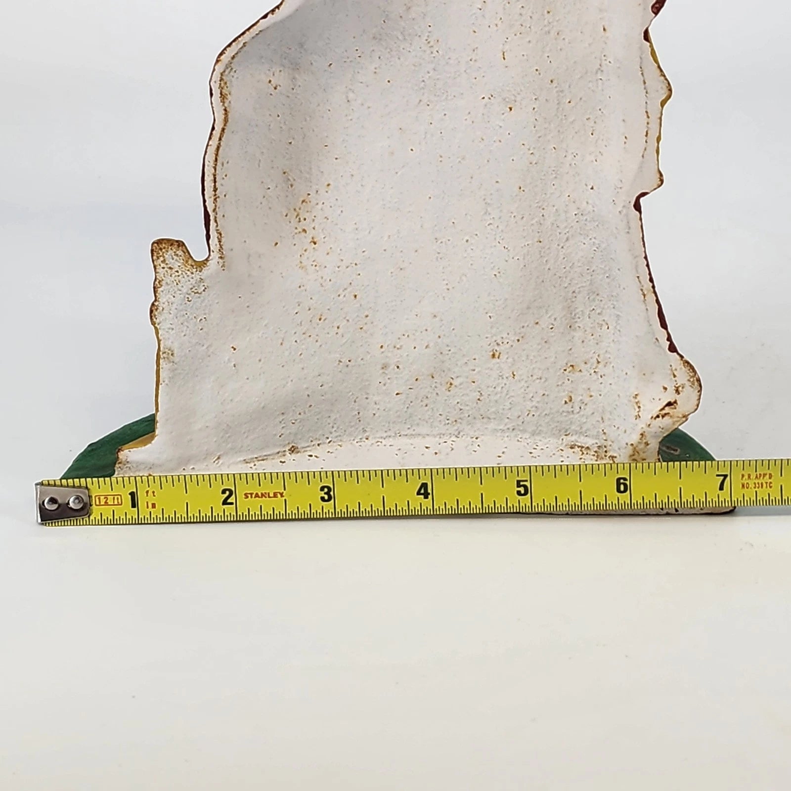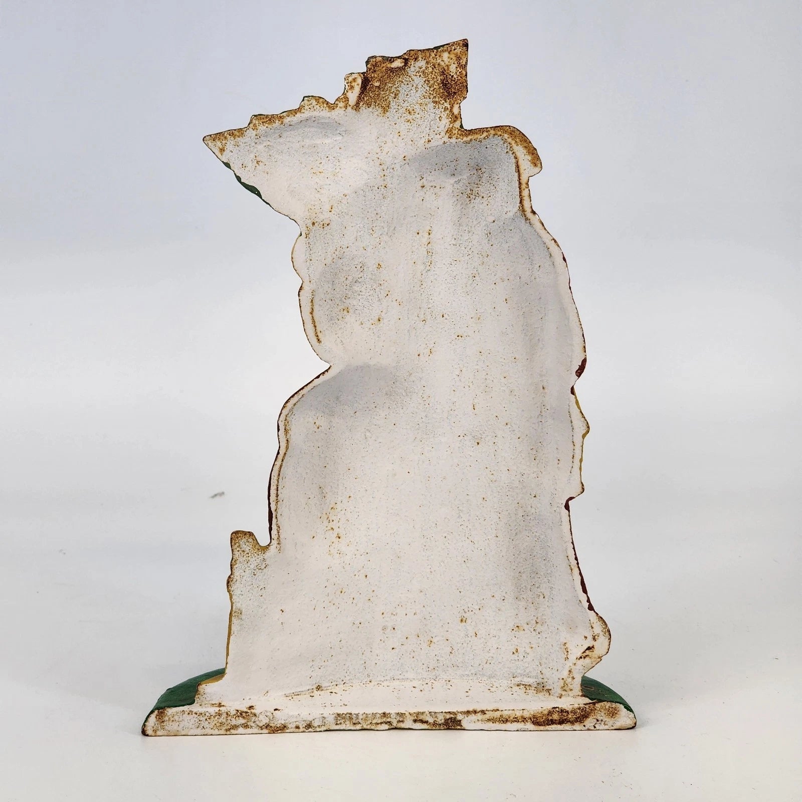 Add a classic touch of holiday nostalgia to your home with this heavy-duty vintage cast iron Santa Claus doorstop. Standing 10 inches tall and weighing 4 pounds, this sturdy piece is both functional and decorative. It features a beautifully detailed relief of Santa holding a miniature Christmas tree and a walking staff, with his iconic sack of toys and a small fireplace at his feet. Hand-painted in traditional holiday colors, this solid iron figurine is perfect for holding open heavy doors during holiday gatherings or as a centerpiece for a rustic Christmas hearth display.