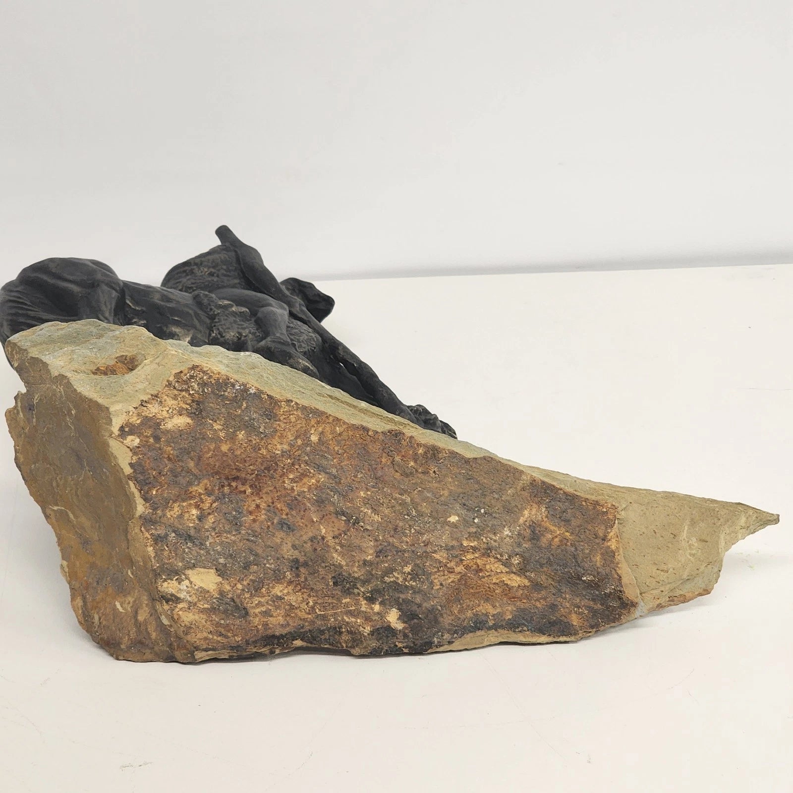 Honor the legacy of the American West with this powerful rendition of James Earle Fraser's iconic "End of the Trail." This substantial 13-inch wide sculpture is crafted from heavy cast metal with a deep bronze-style patina, capturing the poignant image of an exhausted Native American warrior and his horse. Uniquely mounted on a thick, rugged natural sandstone base, this piece offers a rustic, earthy aesthetic that sets it apart from standard wooden-base reproductions. Weighing over six pounds, it serves as a commanding centerpiece for an office, study, or any space dedicated to Western Americana and history.