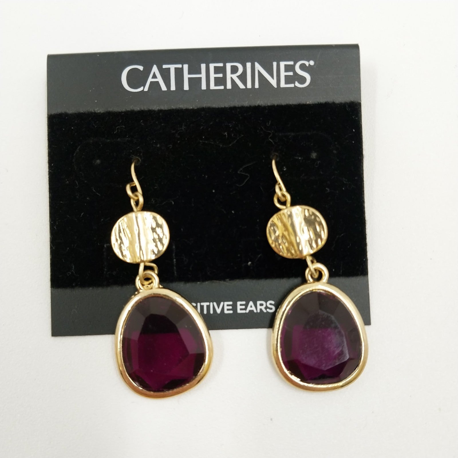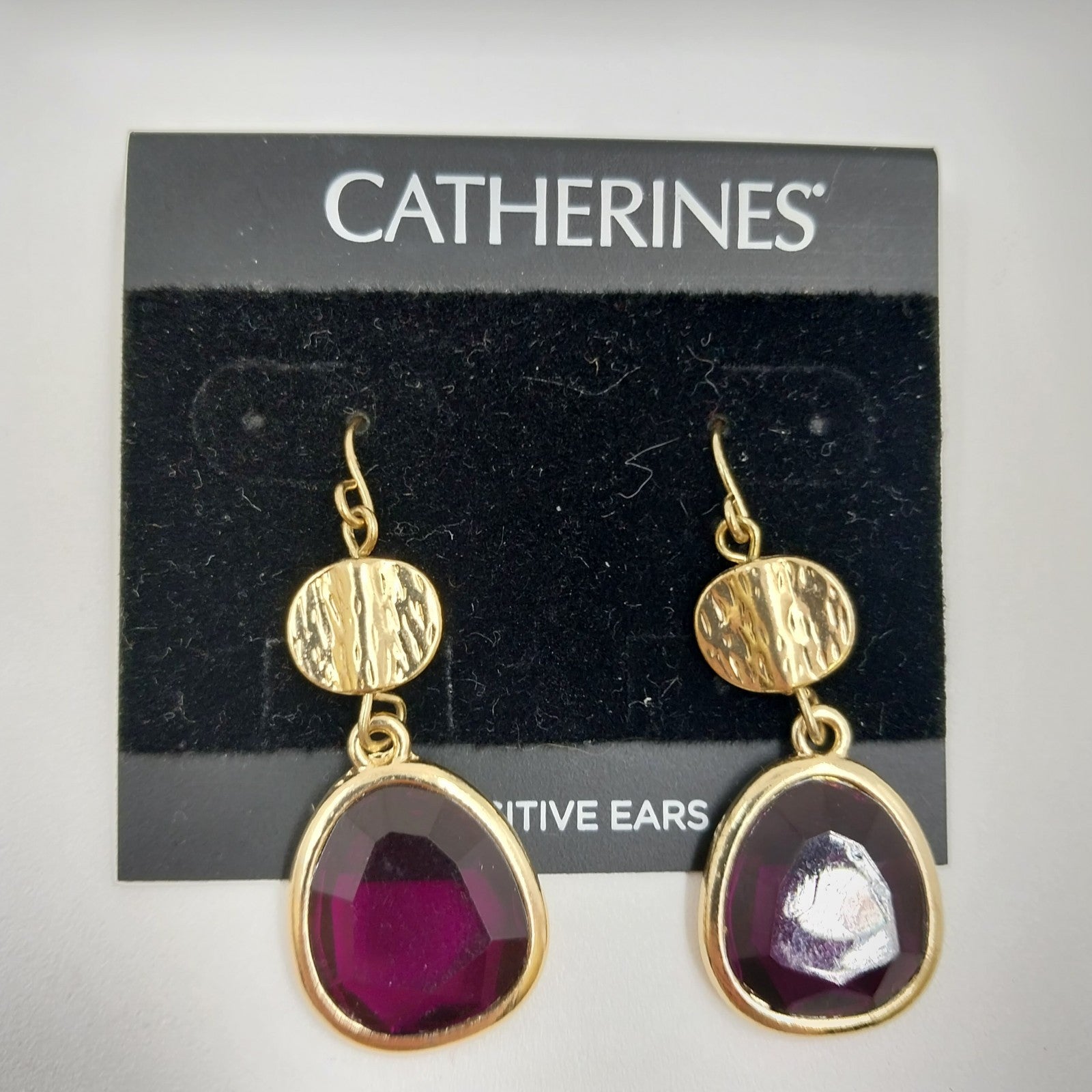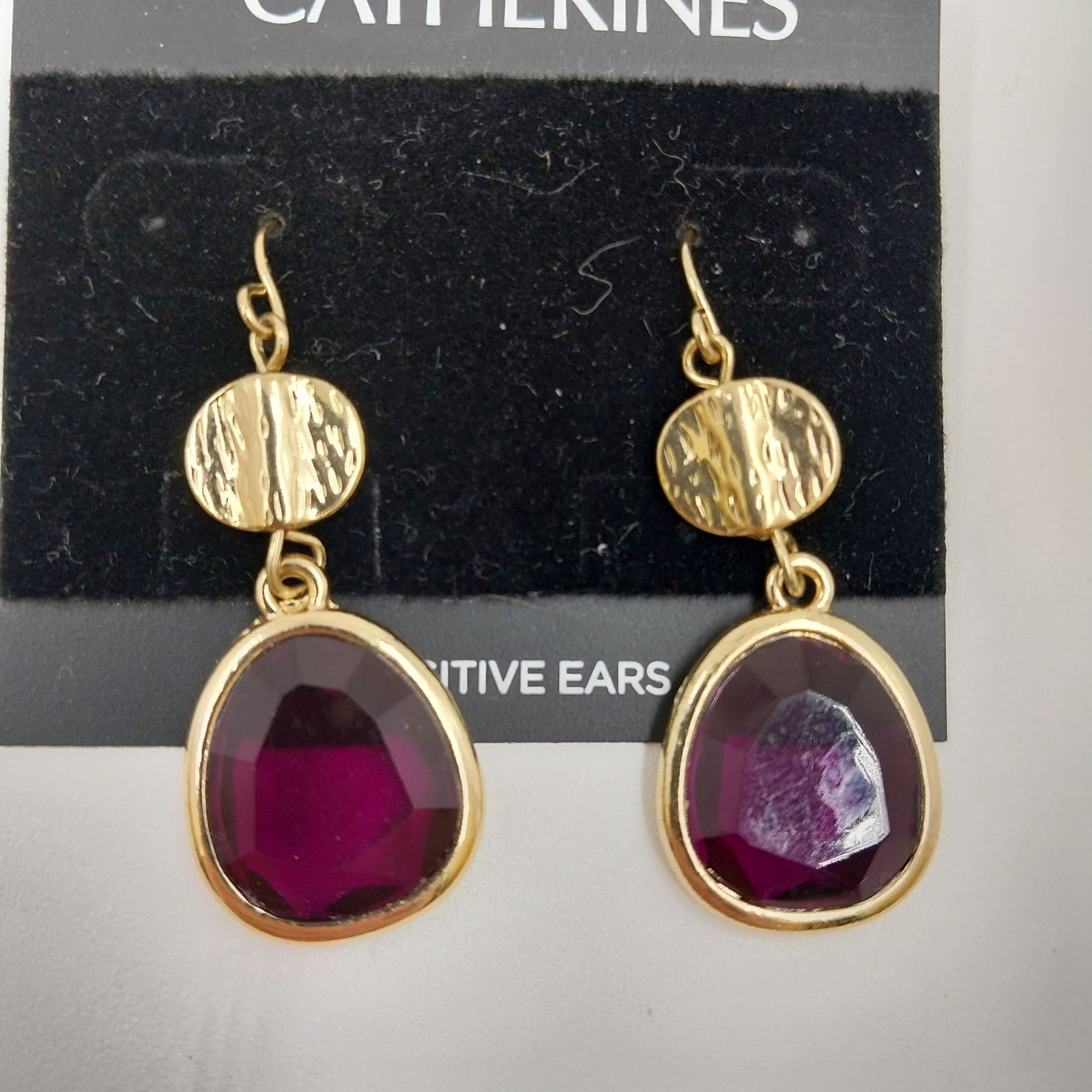 Catherines Earrings Garnet Gold Tone Disc with Purple Rhinestone Dangle 1.5"