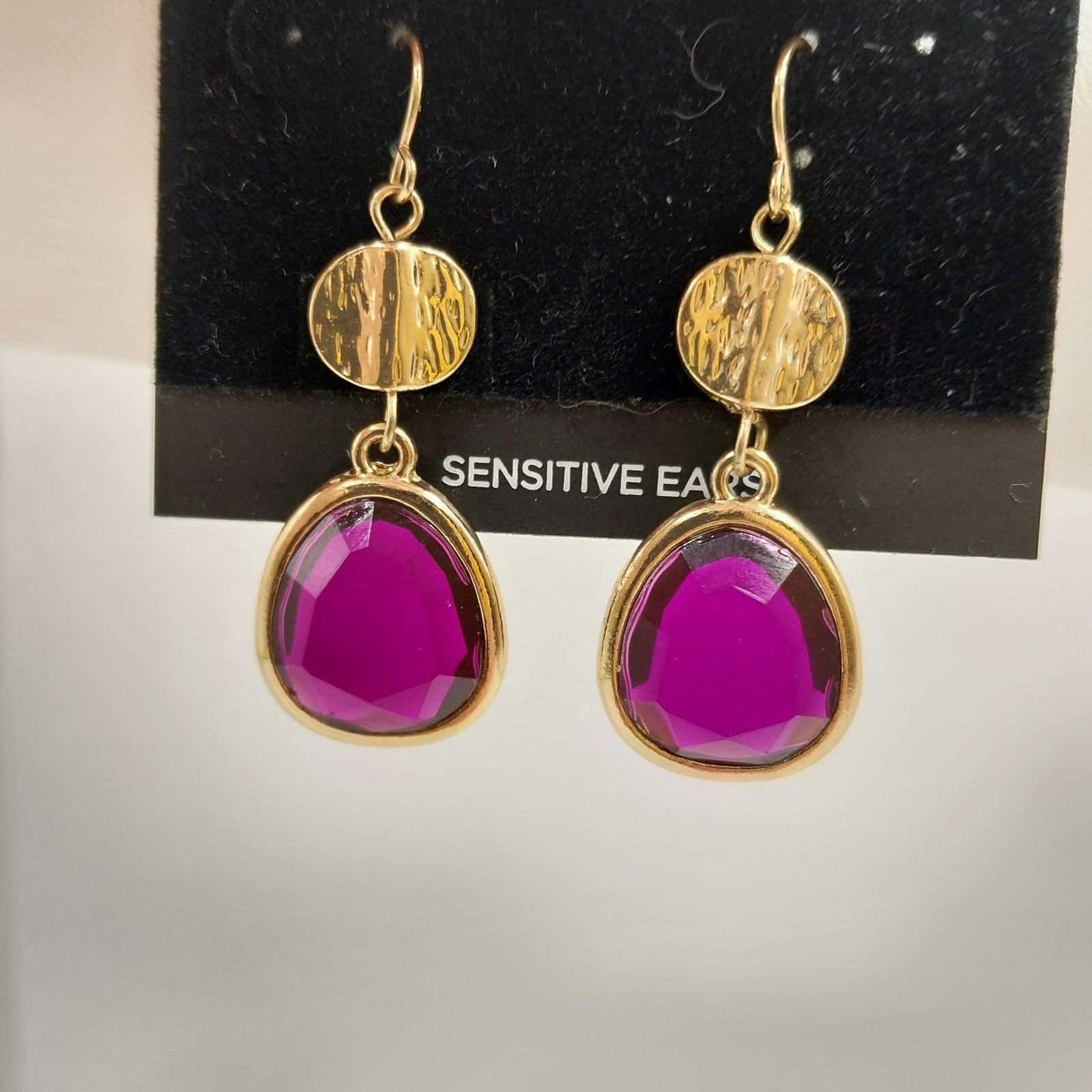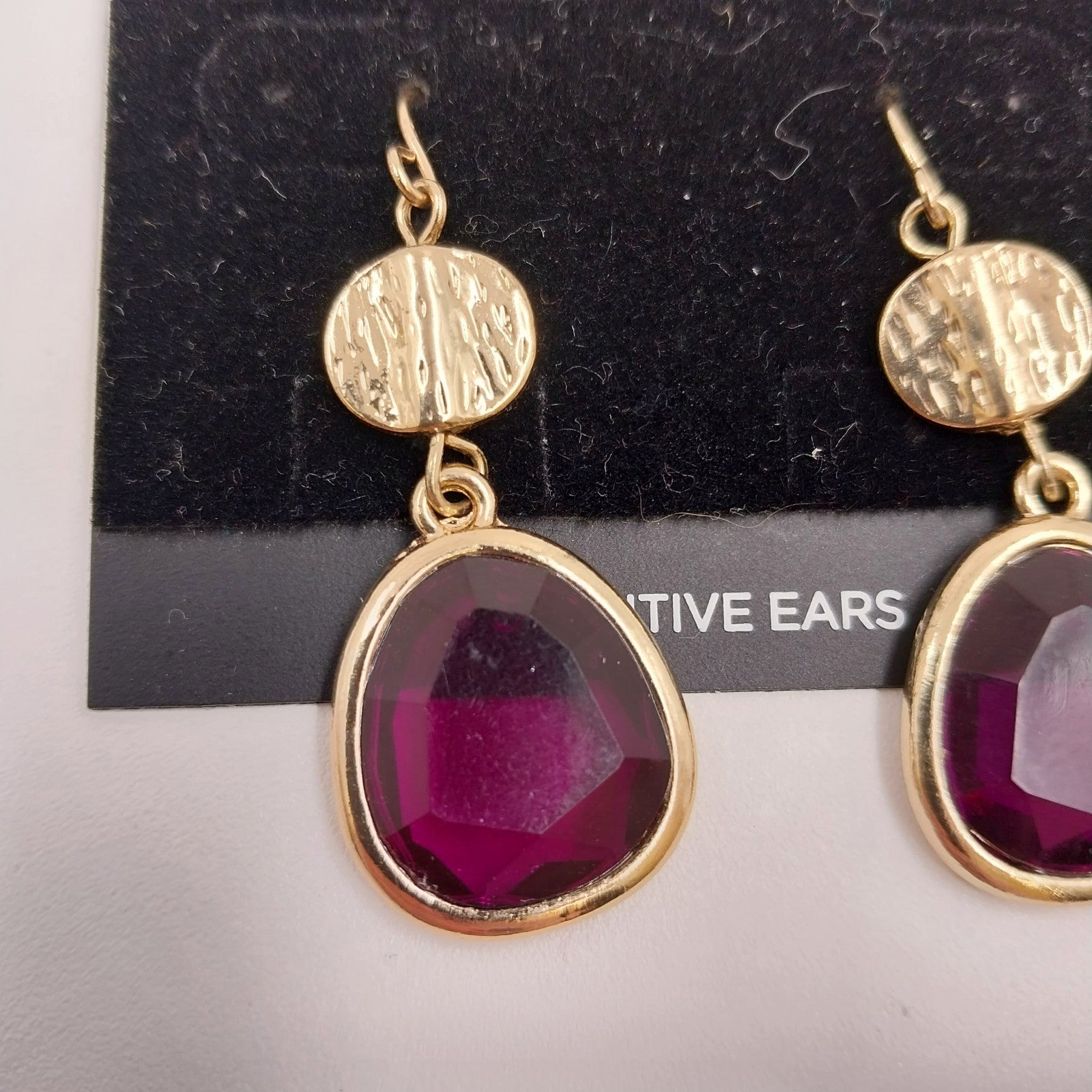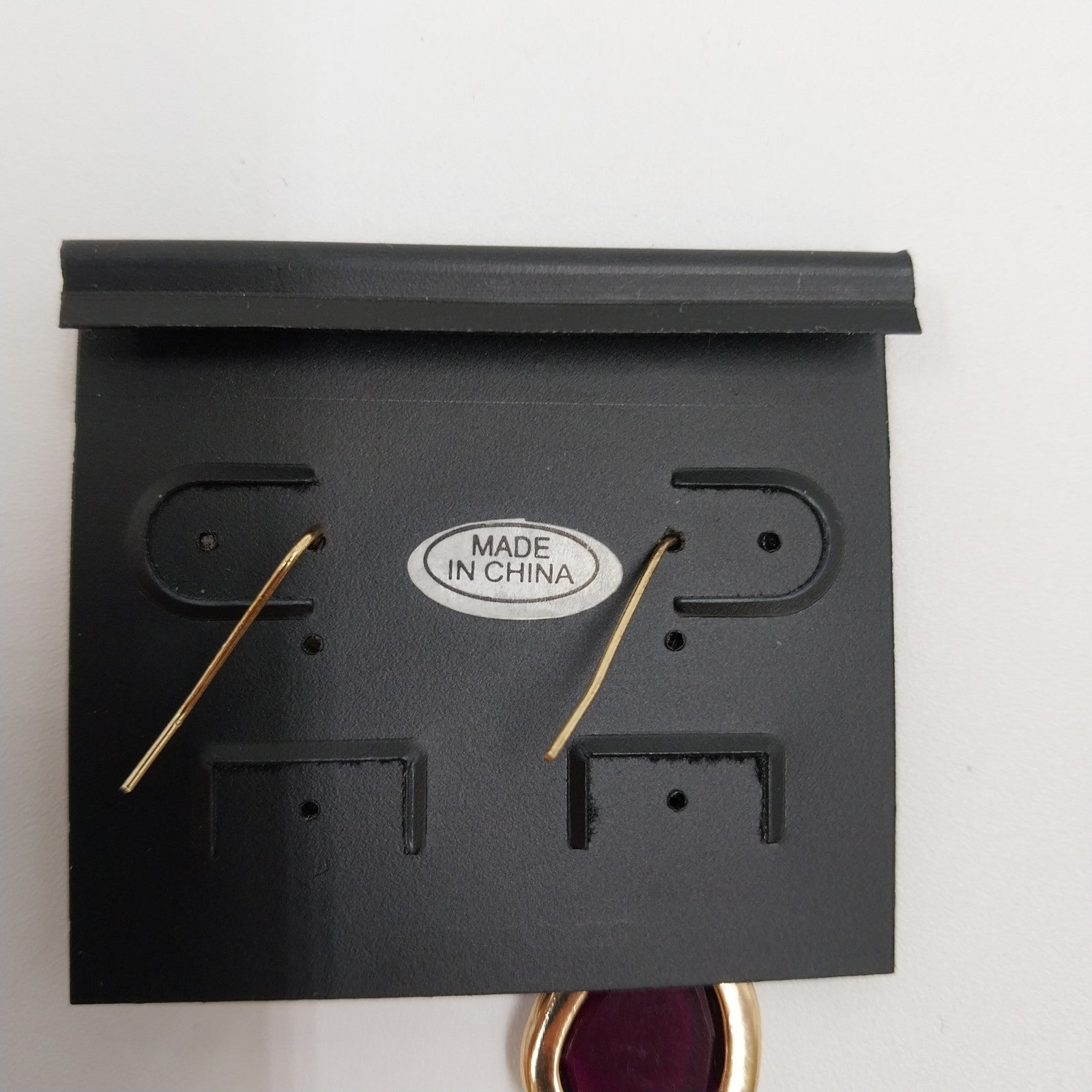 Catherines Earrings Garnet Gold Tone Disc with Purple Rhinestone Dangle 1.5"