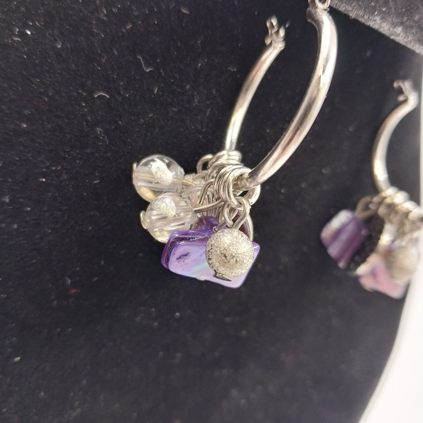 Catherines Silver Tone with Lilac Clear White Drop Dangle Beads Earrings 1"