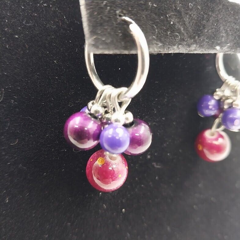 These vintage Catherines earrings showcase a small silver-tone hoop adorned with red, blue, and violet bead ball dangles. Perfect for sensitive ears, they bring a vibrant and chic touch to any outfit.