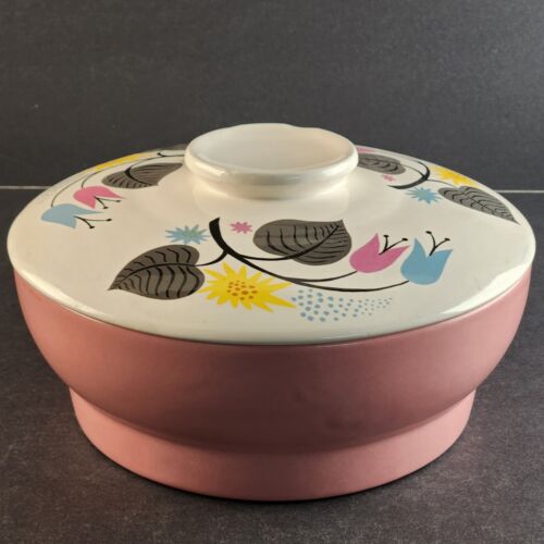 Ceramic Pottery Pink&White Vintage Covered Casserole Dish 9" Across x 4.5" T