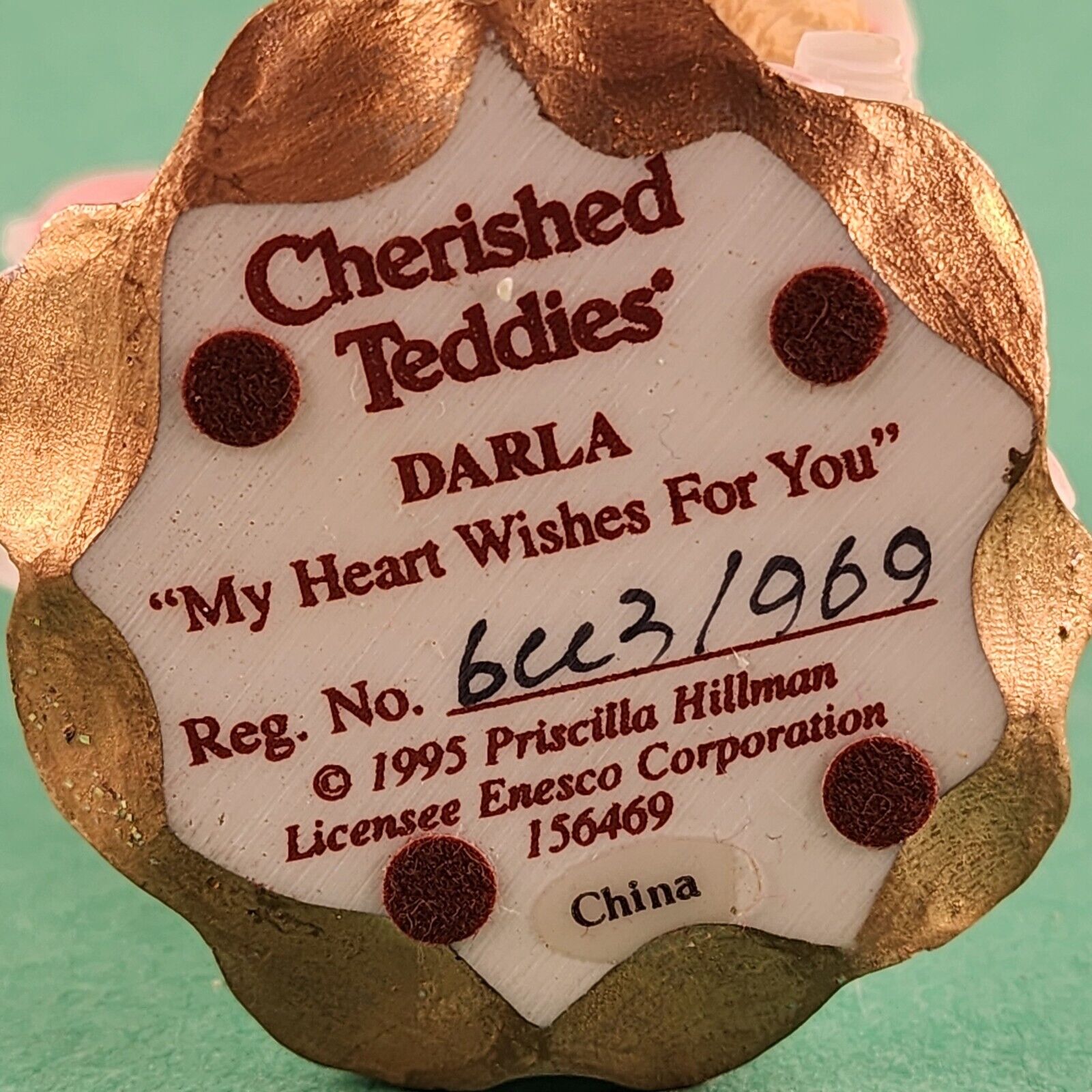 Collectible Cherished Teddies figurine by Enesco Corp, featuring the adorable "Darla" design. This numbered piece is part of the cherished collection known for its intricate details and heartwarming themes.