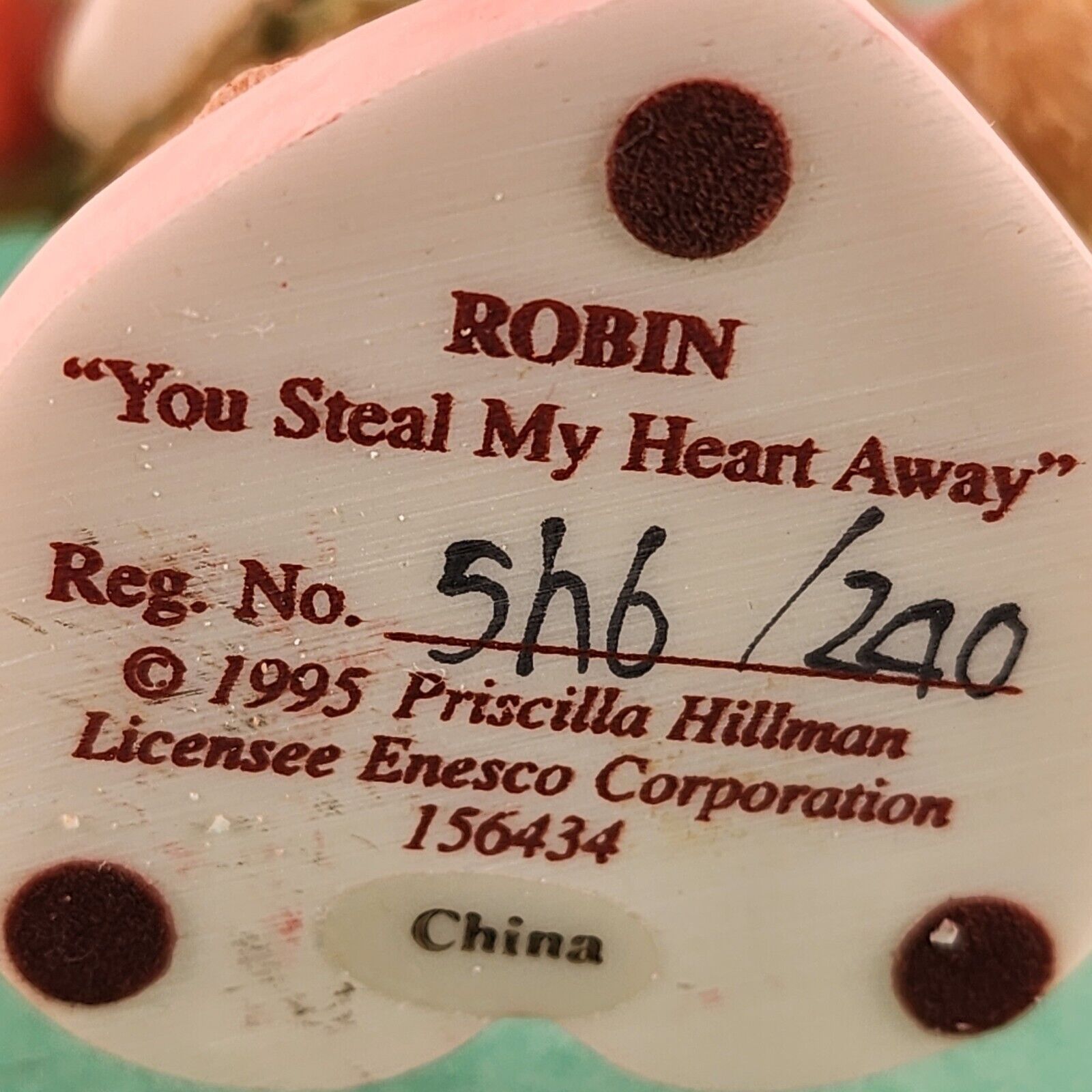 Capture the essence of nostalgia with Cherished Teddies "Robin," a delightful porcelain figurine from Enesco Corp's 1995 collection. This charming piece showcases Robin in a classic, heartwarming pose, making it a timeless addition to any Cherished Teddies collection or a thoughtful gift for collectors.