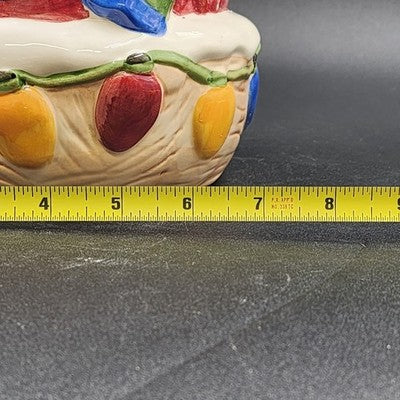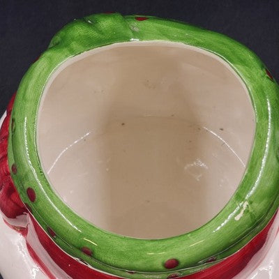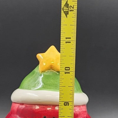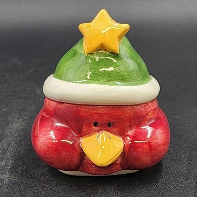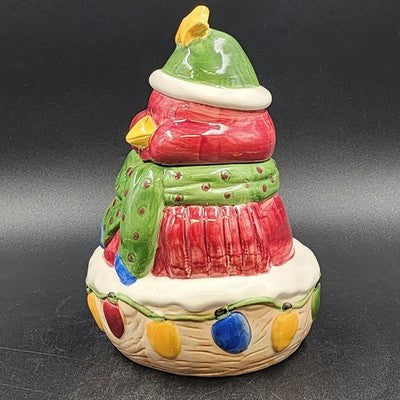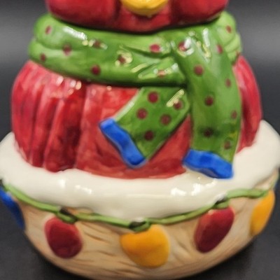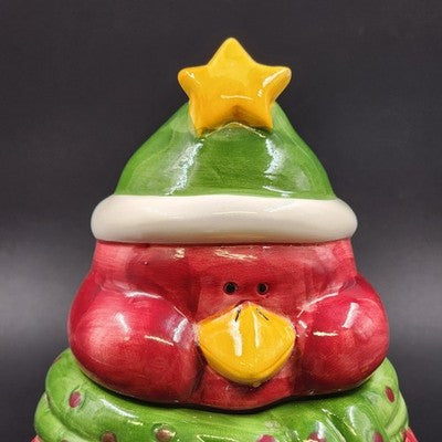 Celebrate the holiday season with this charming Christmas cookie jar featuring a burgundy bird dressed in a festive hat and scarf. Standing 10.75 inches tall, this delightful piece adds a cheerful touch to your kitchen or holiday table.