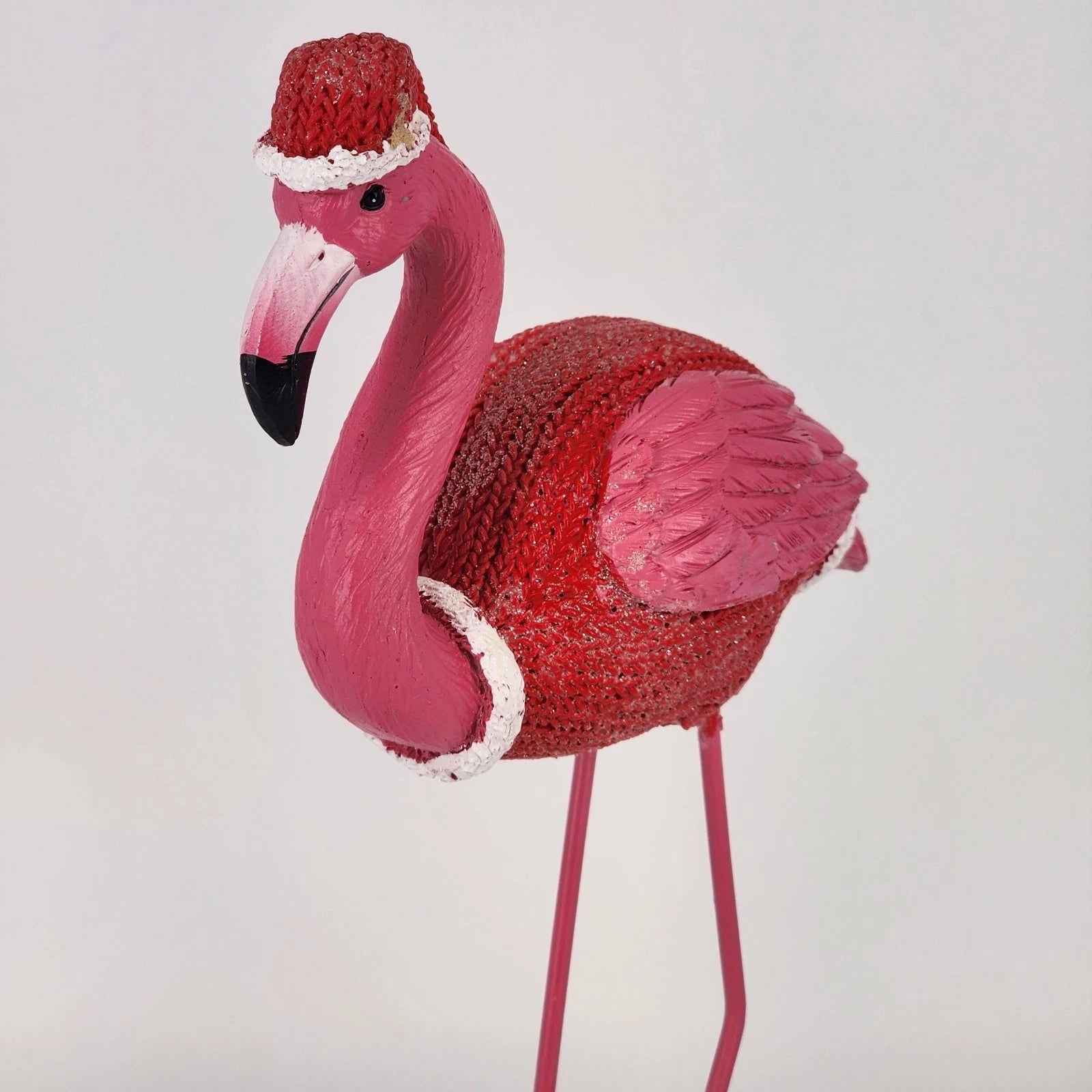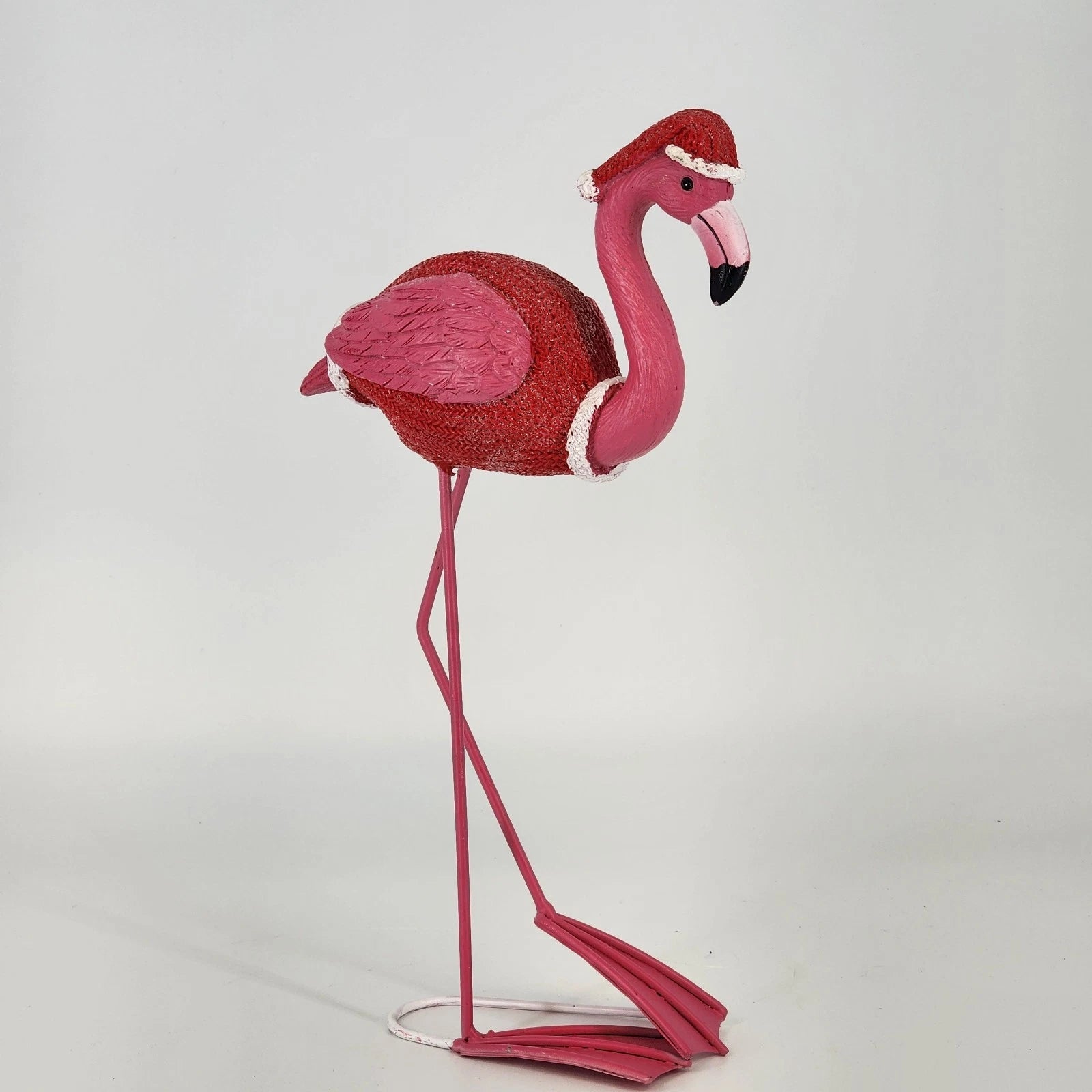 Add a splash of tropical holiday cheer to your home with this whimsical Christmas Flamingo figurine. Standing 11 inches tall, this festive bird is crafted from resin and features poseable-style wire legs. It comes perfectly dressed for the winter season in a cozy, miniature knit coat and matching pom-pom hat. It's a must-have for anyone who loves "Florida-style" Christmas decor or unique bird collectibles.
