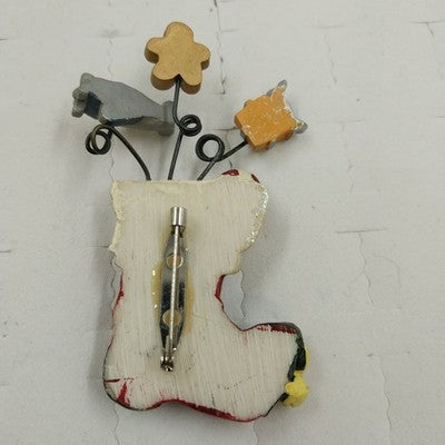 Celebrate the joy of the season with this delightful Christmas stocking brooch made of multicolored clay. Featuring a festive white glittery cuff, the boot is overflowing with holiday cheer-a candy cane, doll, airplane, gift box, and a gingerbread man peek out, making this piece full of whimsical charm. A perfect accessory to elevate any holiday outfit.