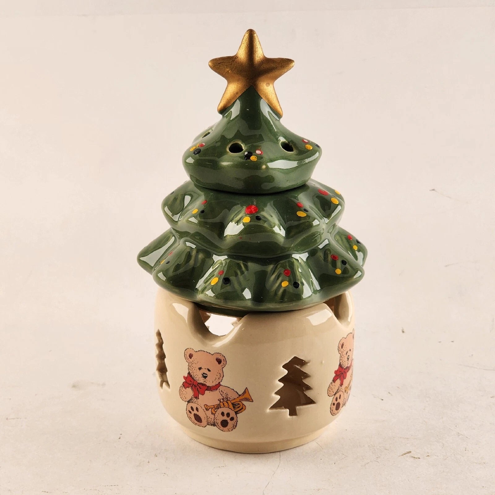 Christmas Tree Stoneware Potpourri Burner 6.5” Santa’s Shelf Teddy Bear Base NOS