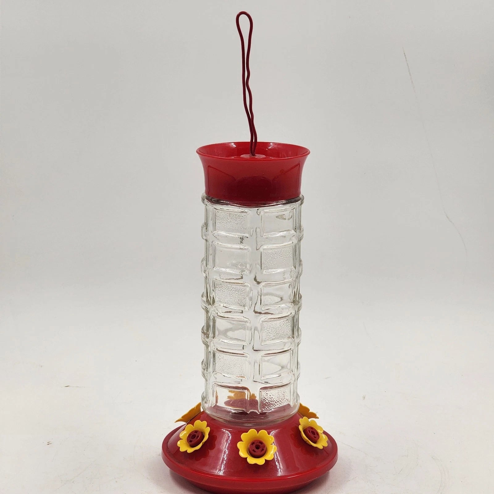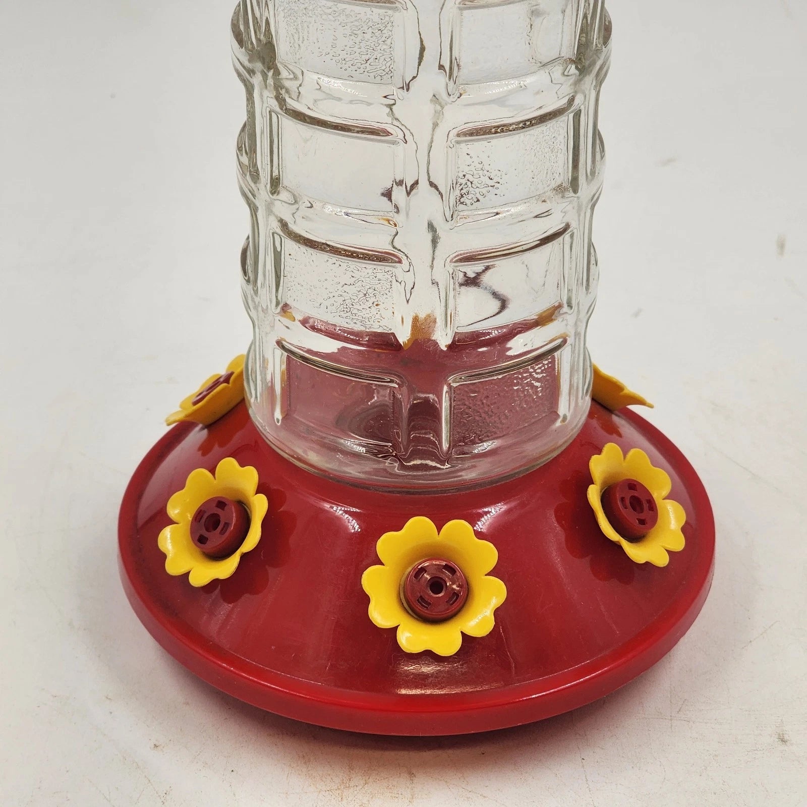 The feeder features a clear glass reservoir that allows you to easily monitor nectar levels. The bottom consists of a bright red plastic base fitted with six (6) yellow, flower-shaped feeding ports, each including a small perch for the birds to rest while feeding. A durable cable hanger is included for easy placement in your garden or yard.