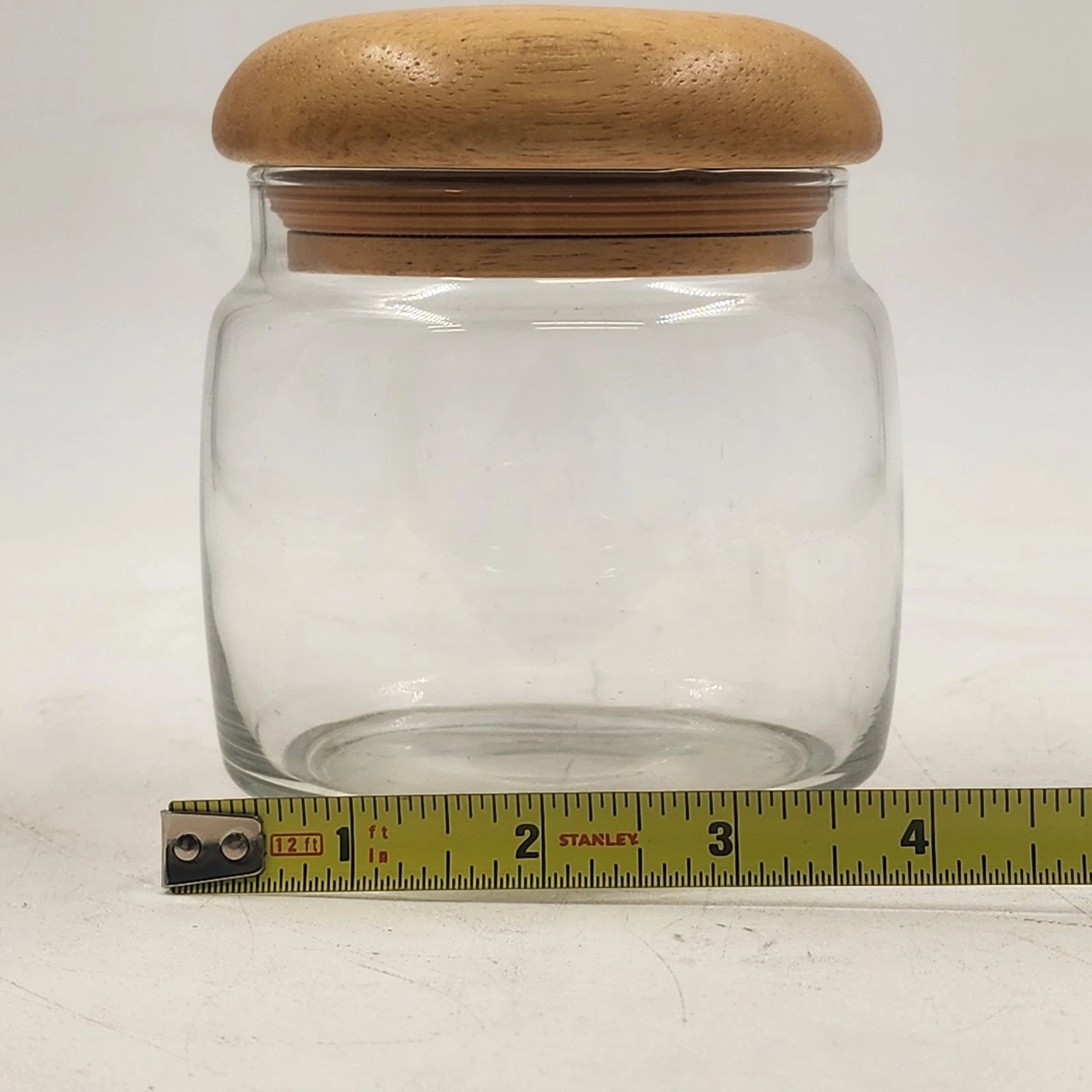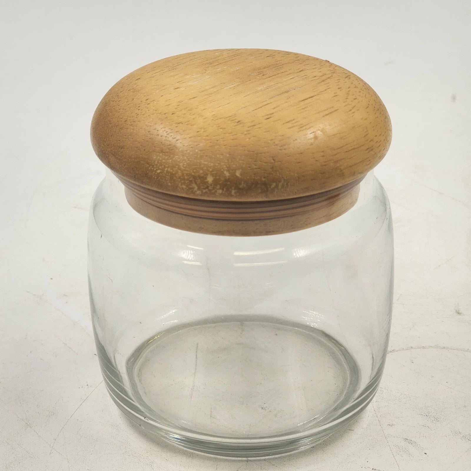 Clear Glass Storage Jar Teak Mushroom Wood Lid Airtight Rubber Seal 4"d x 4.5"h