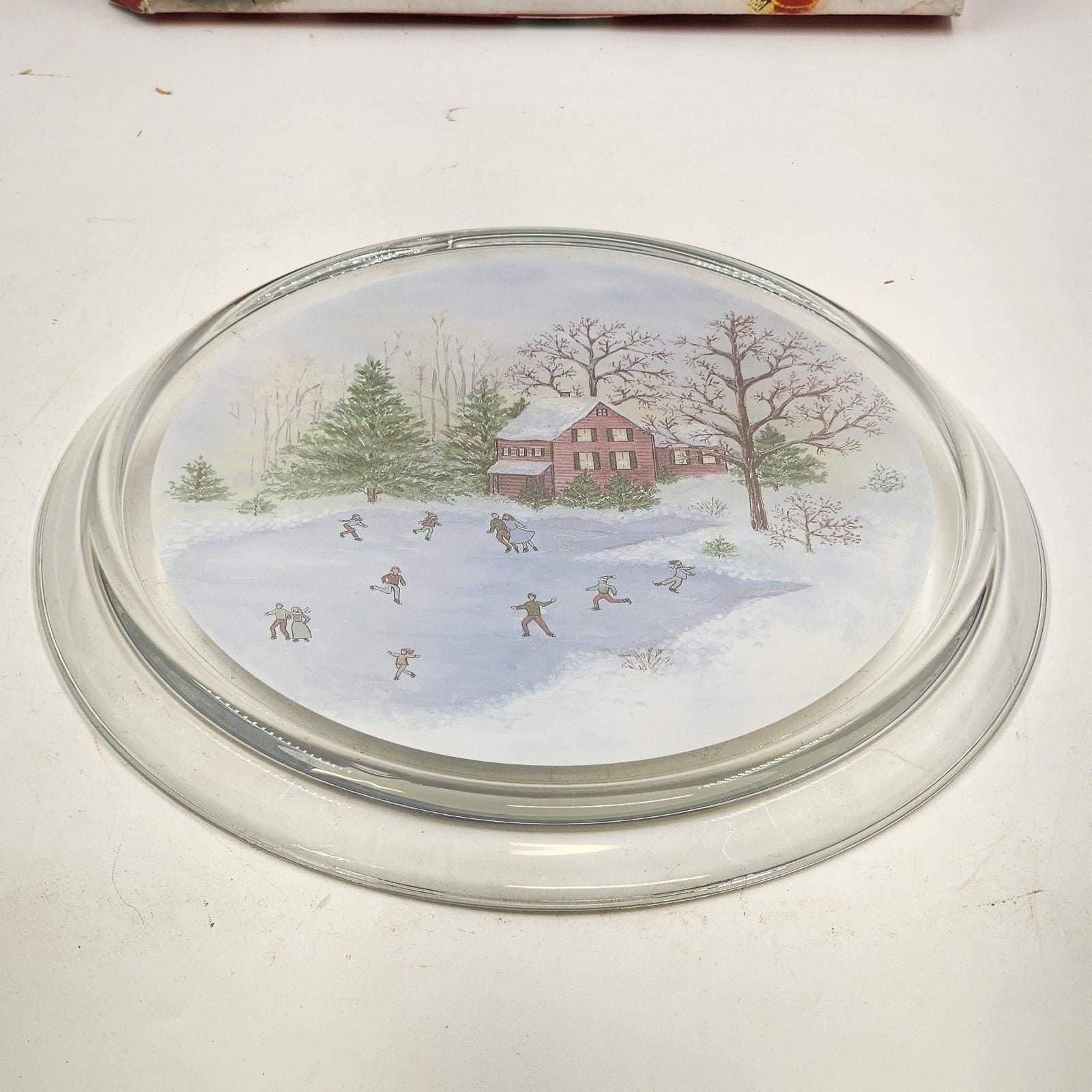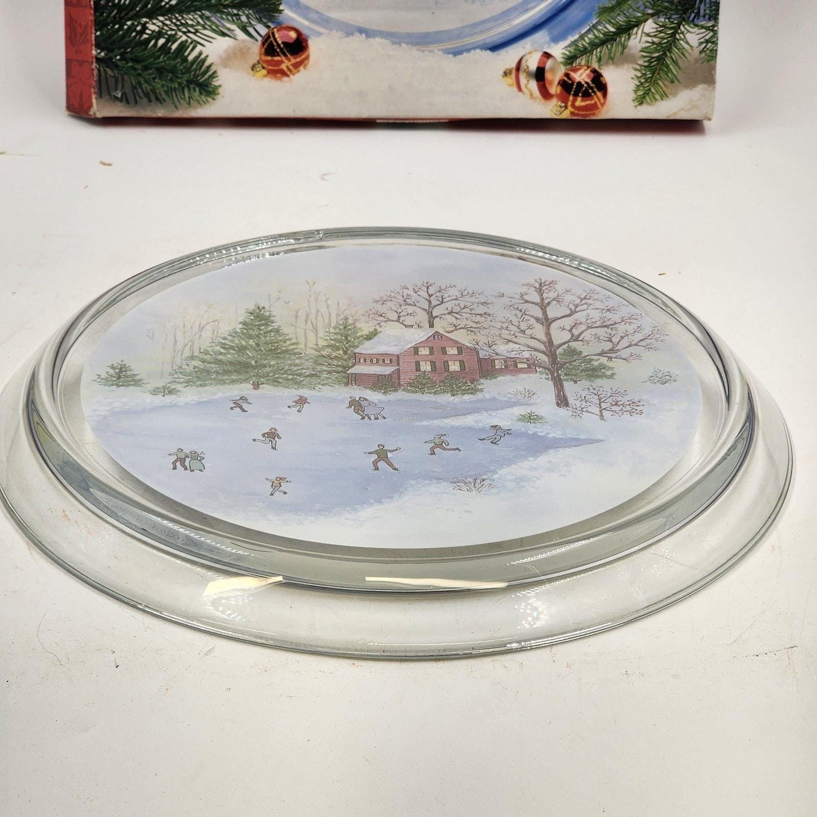 Add a touch of nostalgic holiday charm to your table with this beautiful Indiana Glass Lancaster Christmas platter. Featuring a classic winter scene of children skating on a frozen pond, this vintage clear glass piece is perfect for serving treats or displaying as seasonal décor.