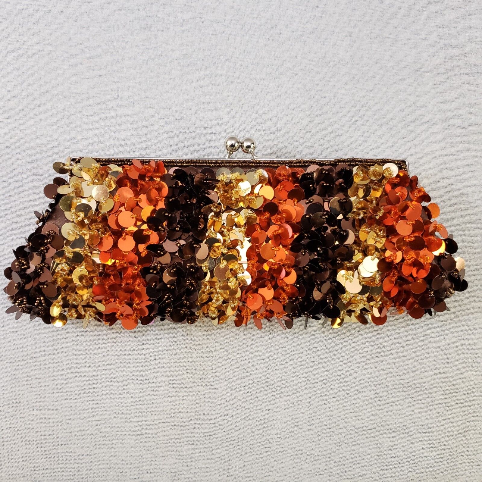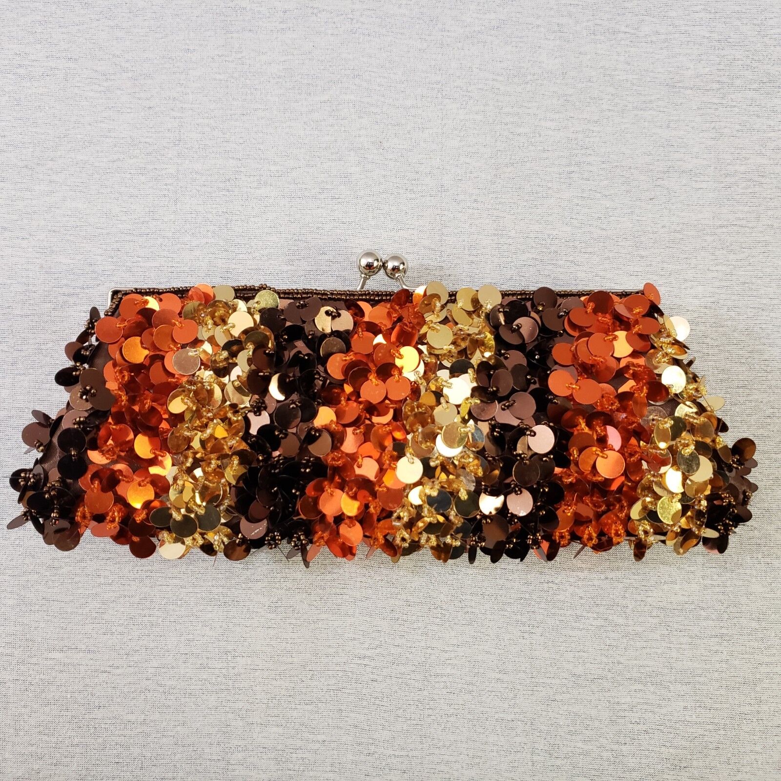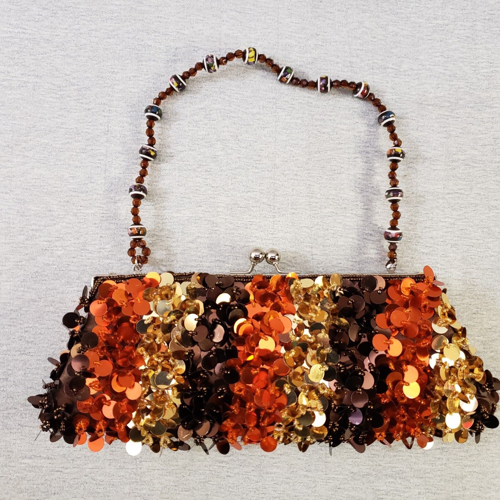 Make a statement at your next event with this brand-new-with-tags beaded evening bag from Cocos International Trading. Style No. EV-1221 features an intricate mix of shimmering beads and 3/8" round sequins in warm bronze, gold, and orange tones.