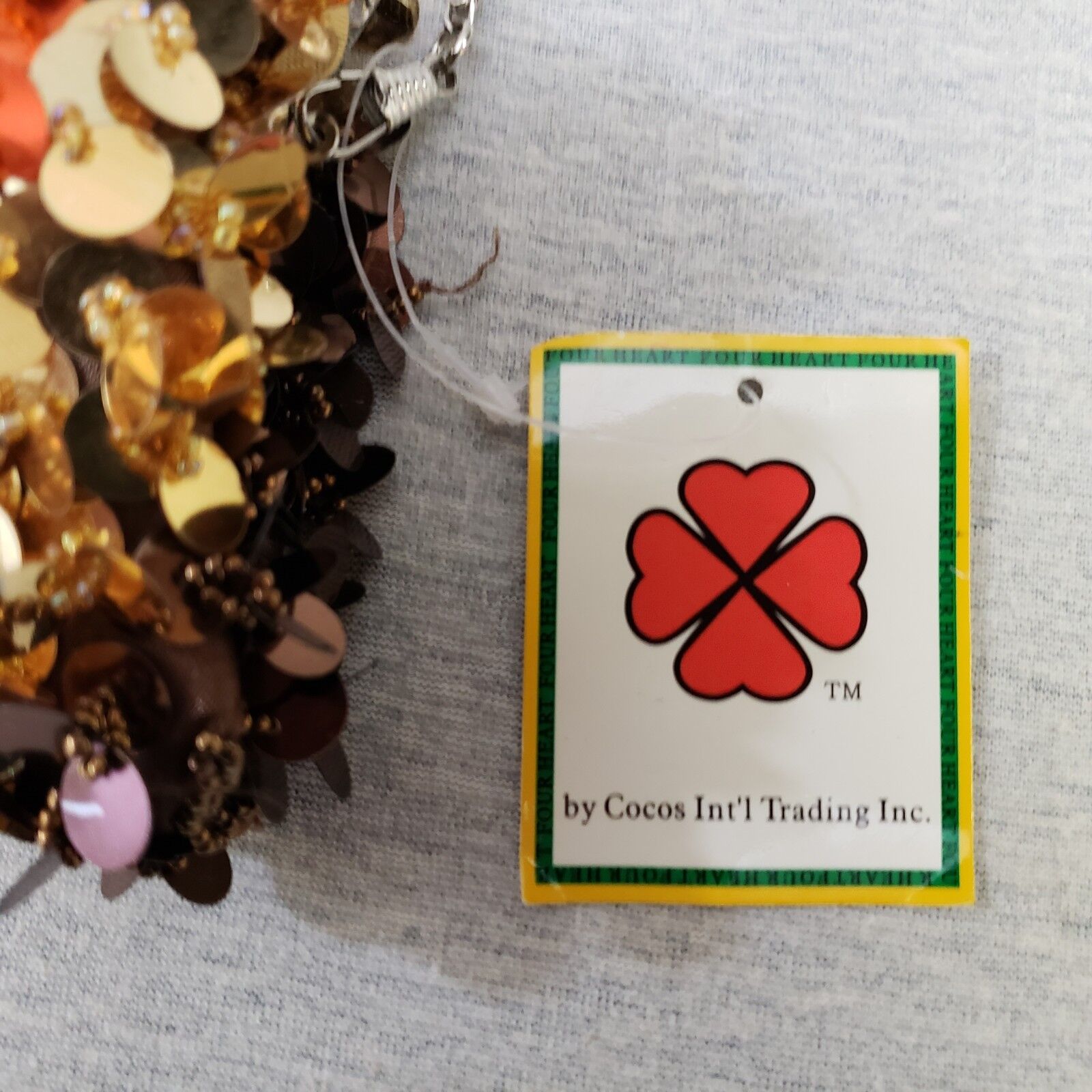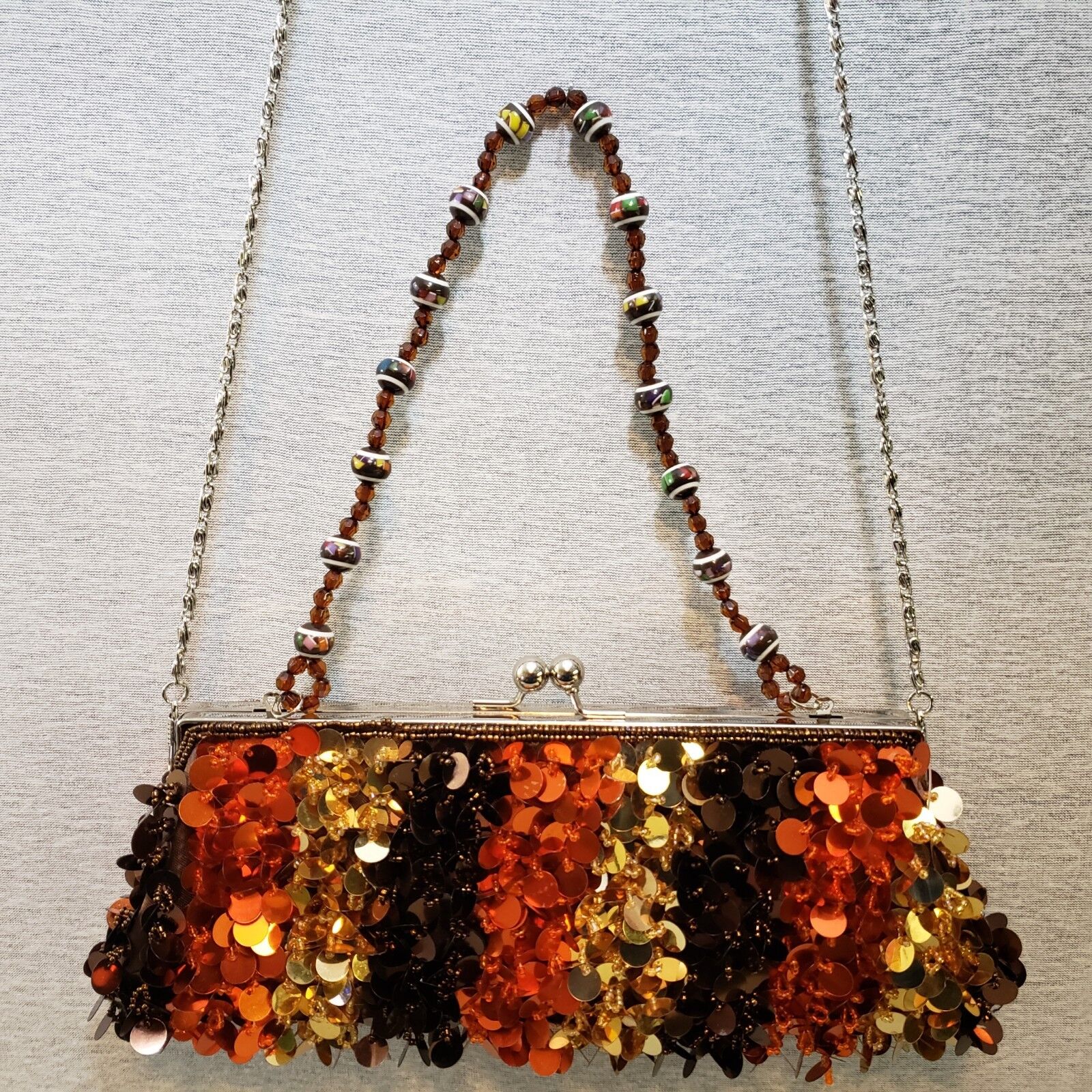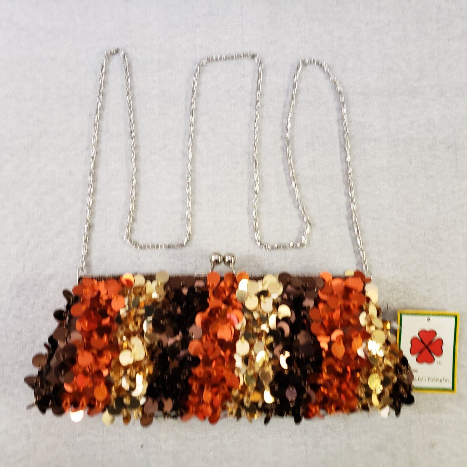 Make a statement at your next event with this brand-new-with-tags beaded evening bag from Cocos International Trading. Style No. EV-1221 features an intricate mix of shimmering beads and 3/8" round sequins in warm bronze, gold, and orange tones.