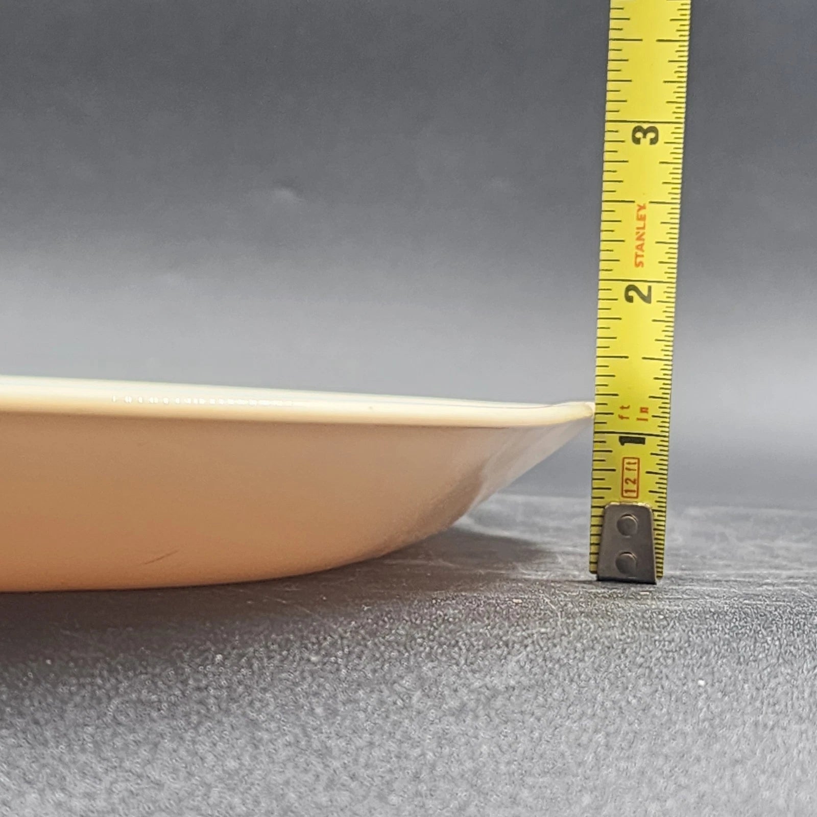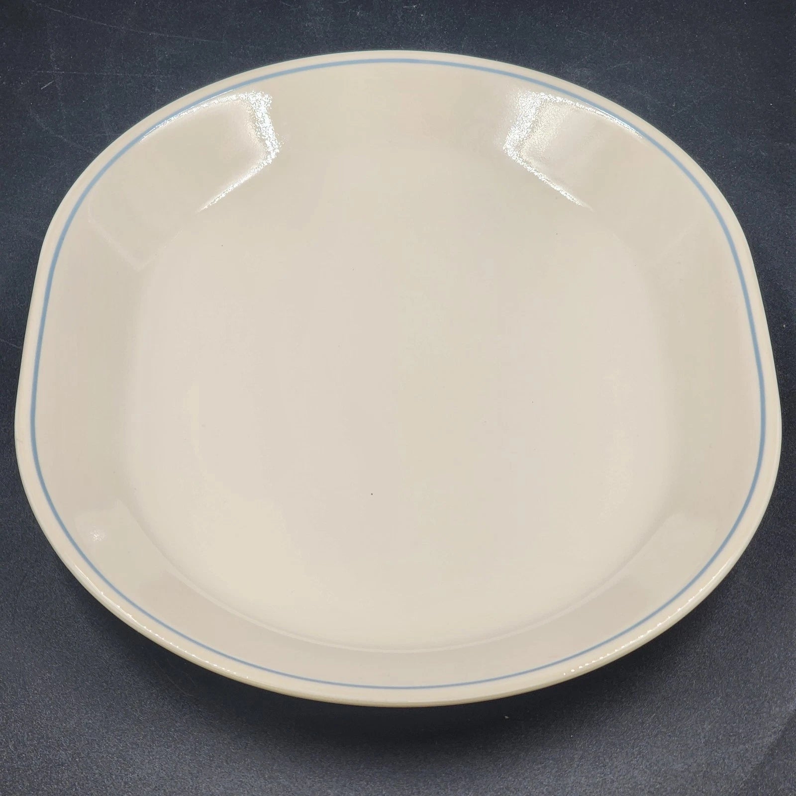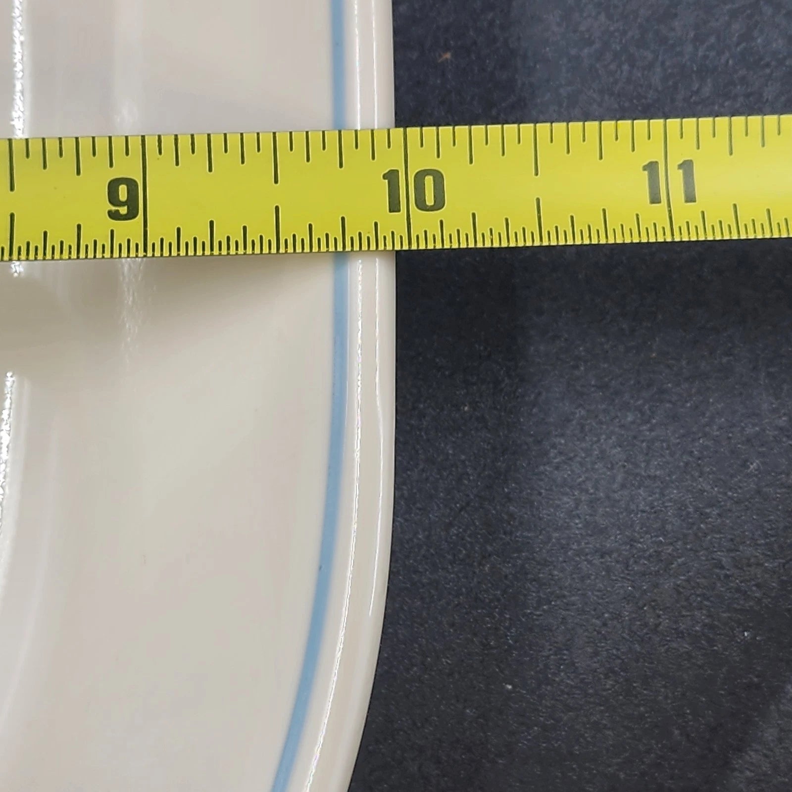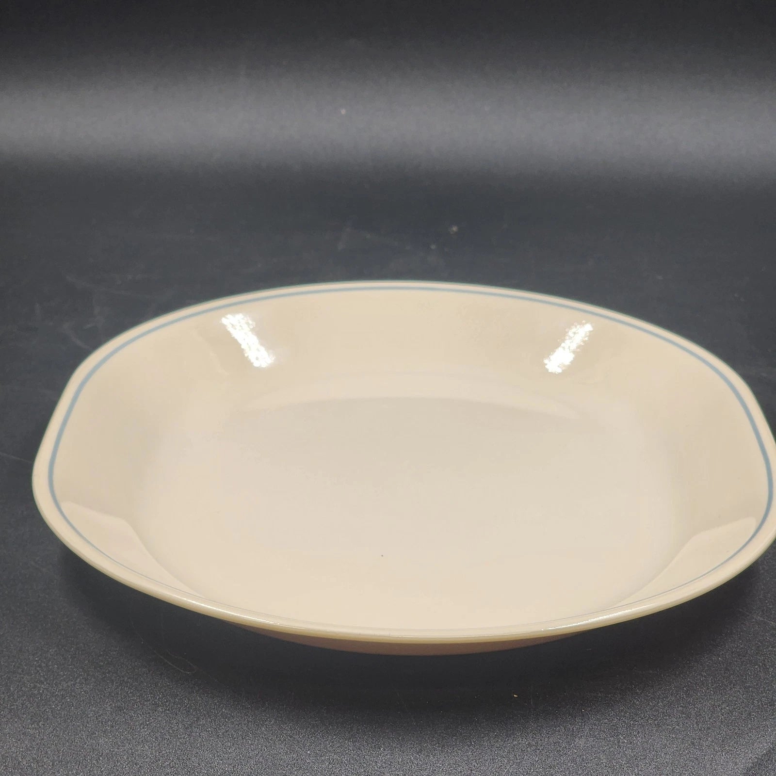 This vintage Corelle oval serving platter in the Blue Lily pattern features a timeless design with a creamy beige (sandstone) base and a subtle blue stripe around the rim. Made in the USA by Corning, this platter showcases the classic durability and charm Corelle is known for.