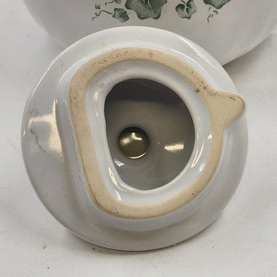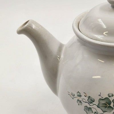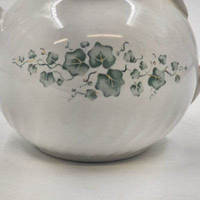 Bring a touch of classic cottage charm to your kitchen or tea table with this vintage Corelle Coordinates Callaway Ivy teapot. Made of durable stoneware and featuring the beloved Callaway green ivy vine pattern on a soft white background, this 5-cup teapot is a must-have for collectors of Corelle, Corning Ware, or retro floral kitchenware.