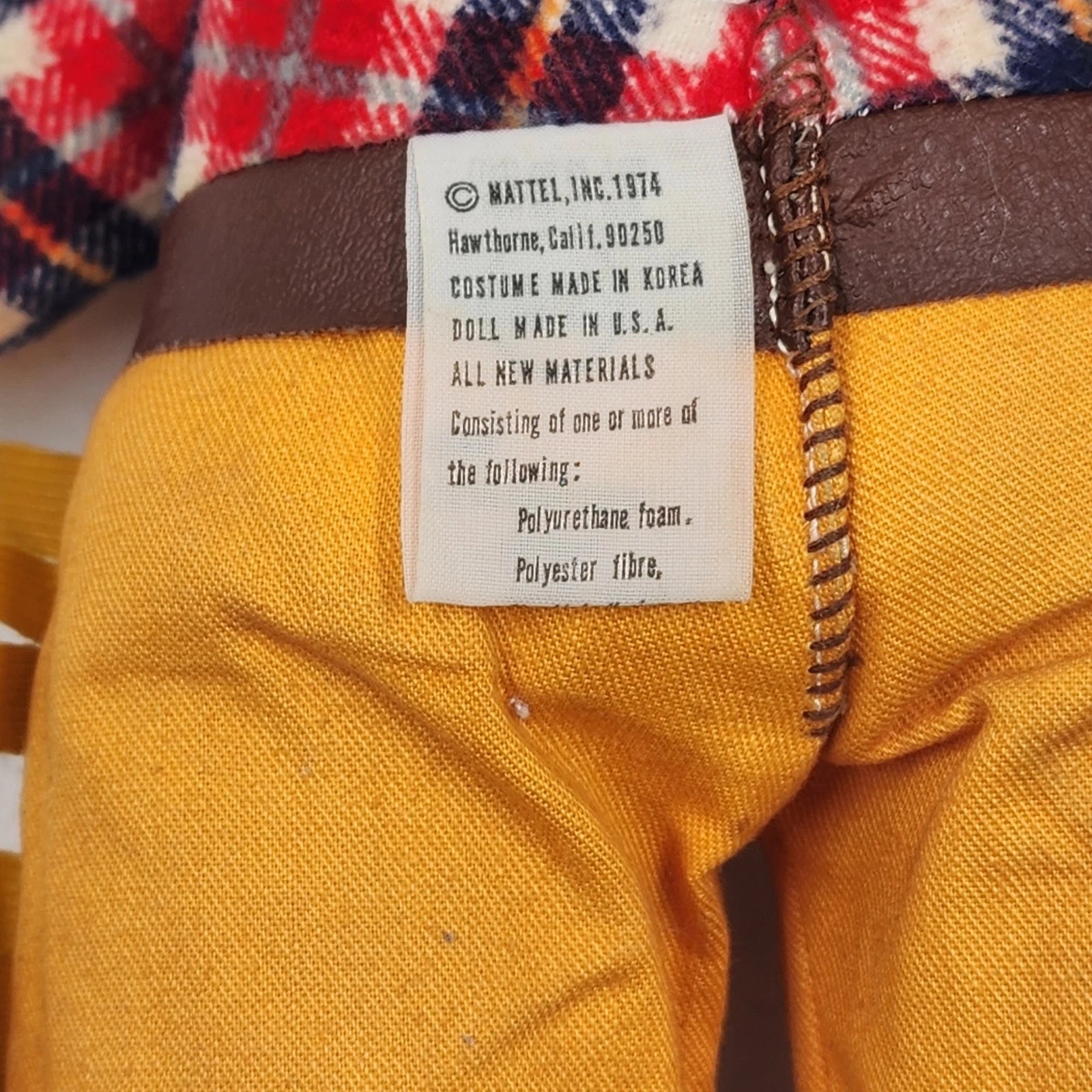 This vintage 1974 Mattel Love Notes Bucky Cowboy Doll is part of Mattel's classic "Love Notes" line of musical squeeze toys. Designed as a musical plush doll, Bucky plays a tune when squeezed and is still in working condition.