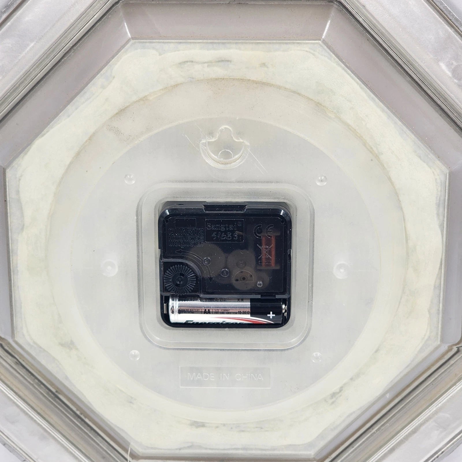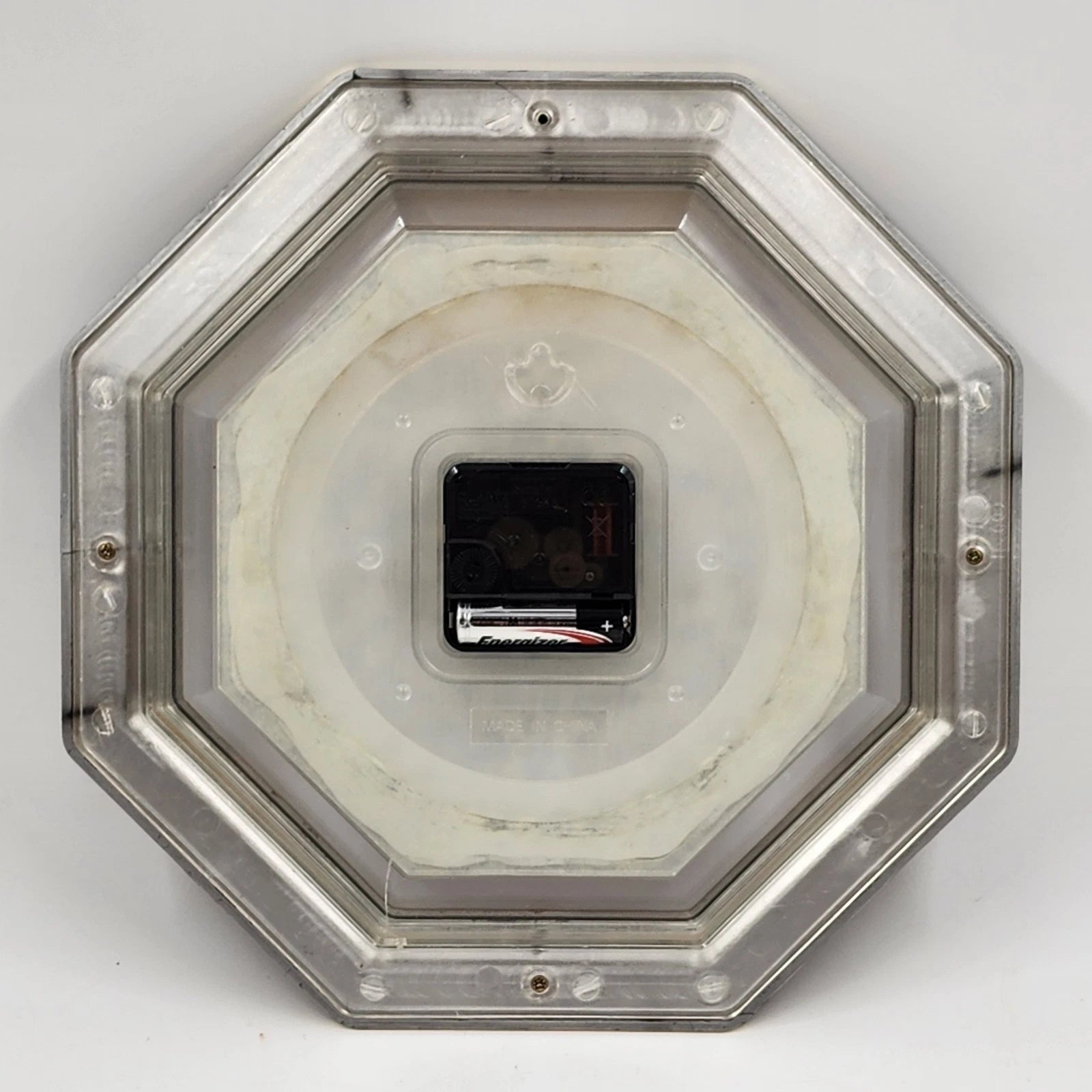 This unique octagonal quartz wall clock celebrates the classic hobby of model racing, featuring a bold design of a vintage Cox Thimble Drome Champion gas-powered race car. The clock face displays detailed text and imagery related to the iconic mini-cars and is framed by a black and lighter inner frame. The clock works have been replaced, and the outer frame has been professionally repaired, ensuring it keeps excellent time.
