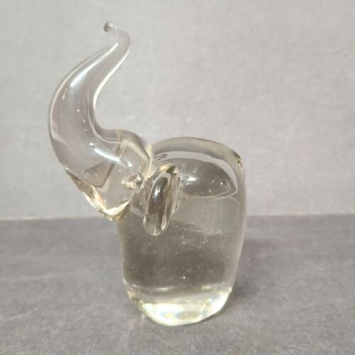 Crystal Clear Elephant Art Glass Figurine Paperweight Trunk Up for Luck Vintage