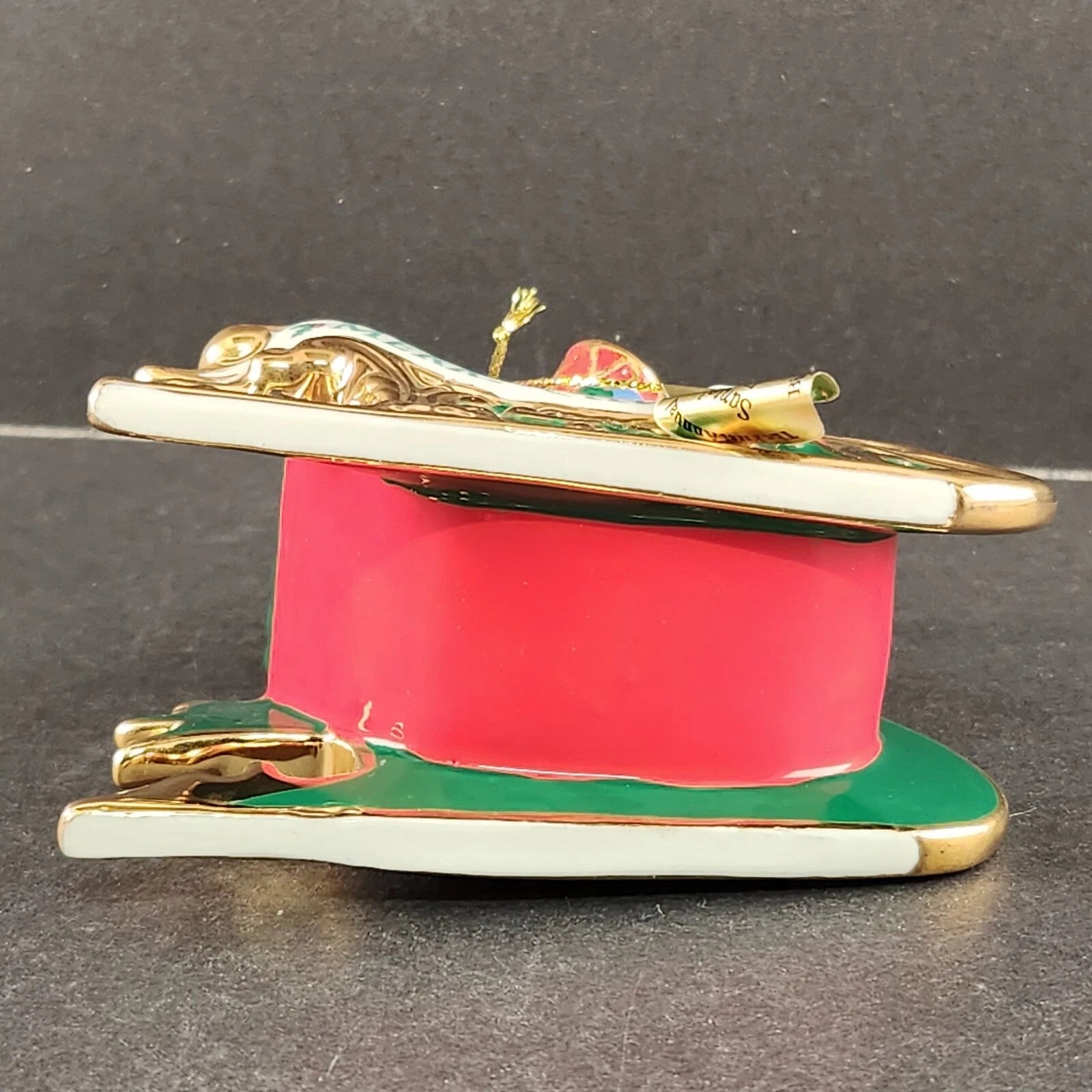 Crafted from high-quality ceramic and porcelain, it showcases intricate details and vibrant colors. The sleigh features a felt bottom, making it ideal for display on a desk, shelf, or as part of your Christmas decor.