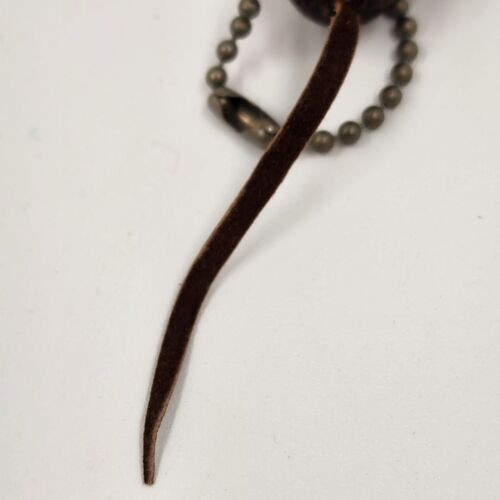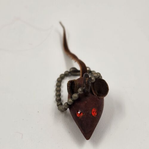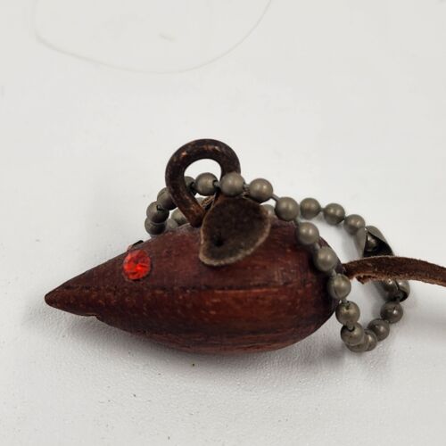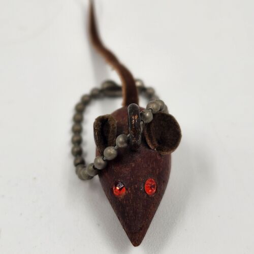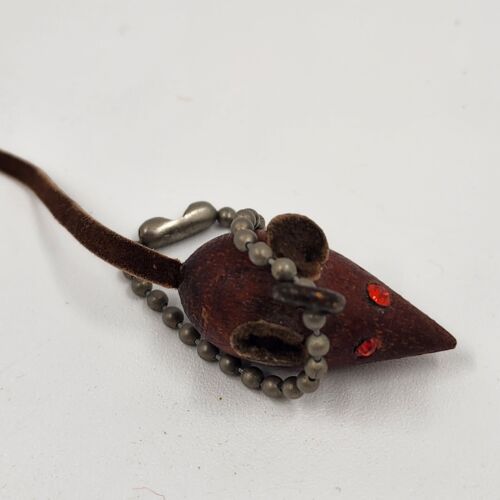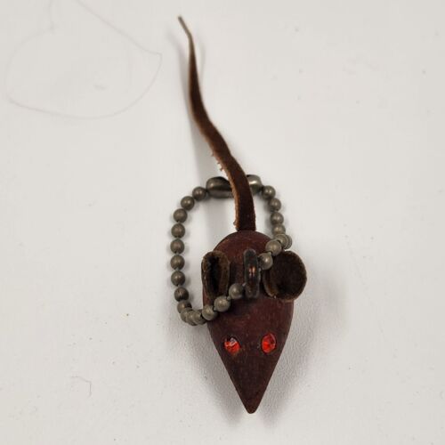 Danish Teak Wood Mouse Keychain Rhinestone Eye Leather Tail Ears Miniature 1.25"