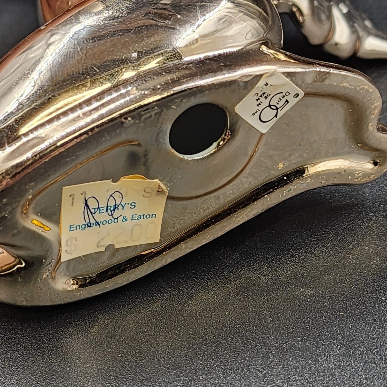 This charming Department 56 cherub angel figurine features a gold-tone finish and depicts a cherub blowing a horn. Perfect for holiday décor or collectors, the piece adds a festive and elegant touch to any display.