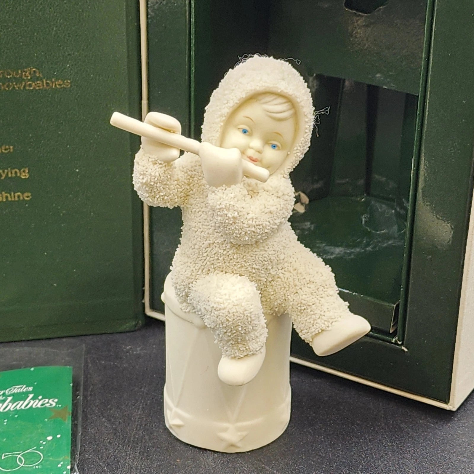 This charming Department 56 Snowbabies figurine titled "I'll Play A Christmas Tune" is a delightful addition to any holiday collection. Introduced in 1986, this porcelain bisque figurine captures the timeless charm of the Snowbabies series.