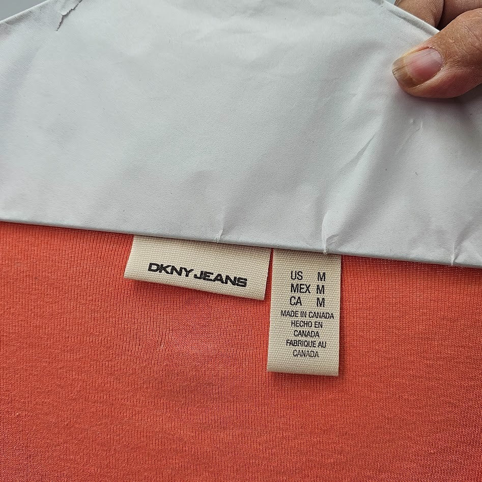 This stylish DKNY Jeans women's top features a peach-orange color with a graphic sparkle design and flattering 3/4 sleeves. A perfect blend of casual comfort and chic detail, making it ideal for everyday wear or a standout casual look.