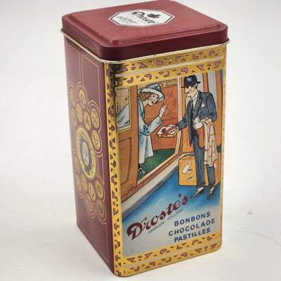 A charming piece of confectionery history, this vintage Droste's Bonbons Chocolade set includes a classic tin can and an empty chocolate box. Featuring nostalgic Dutch advertising graphics, it's a perfect collectible for vintage kitchen decor or advertising enthusiasts.
