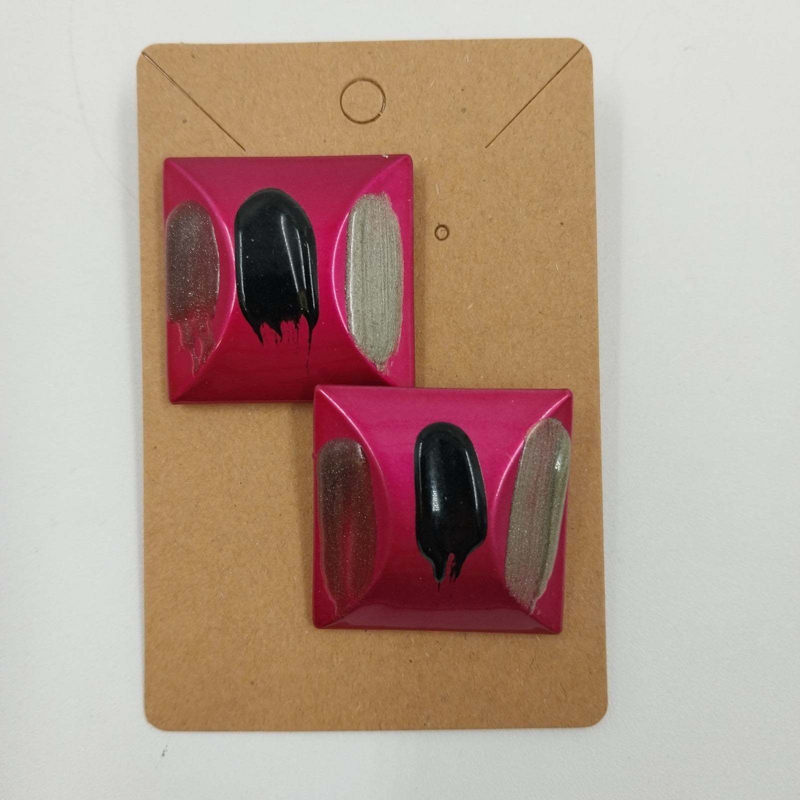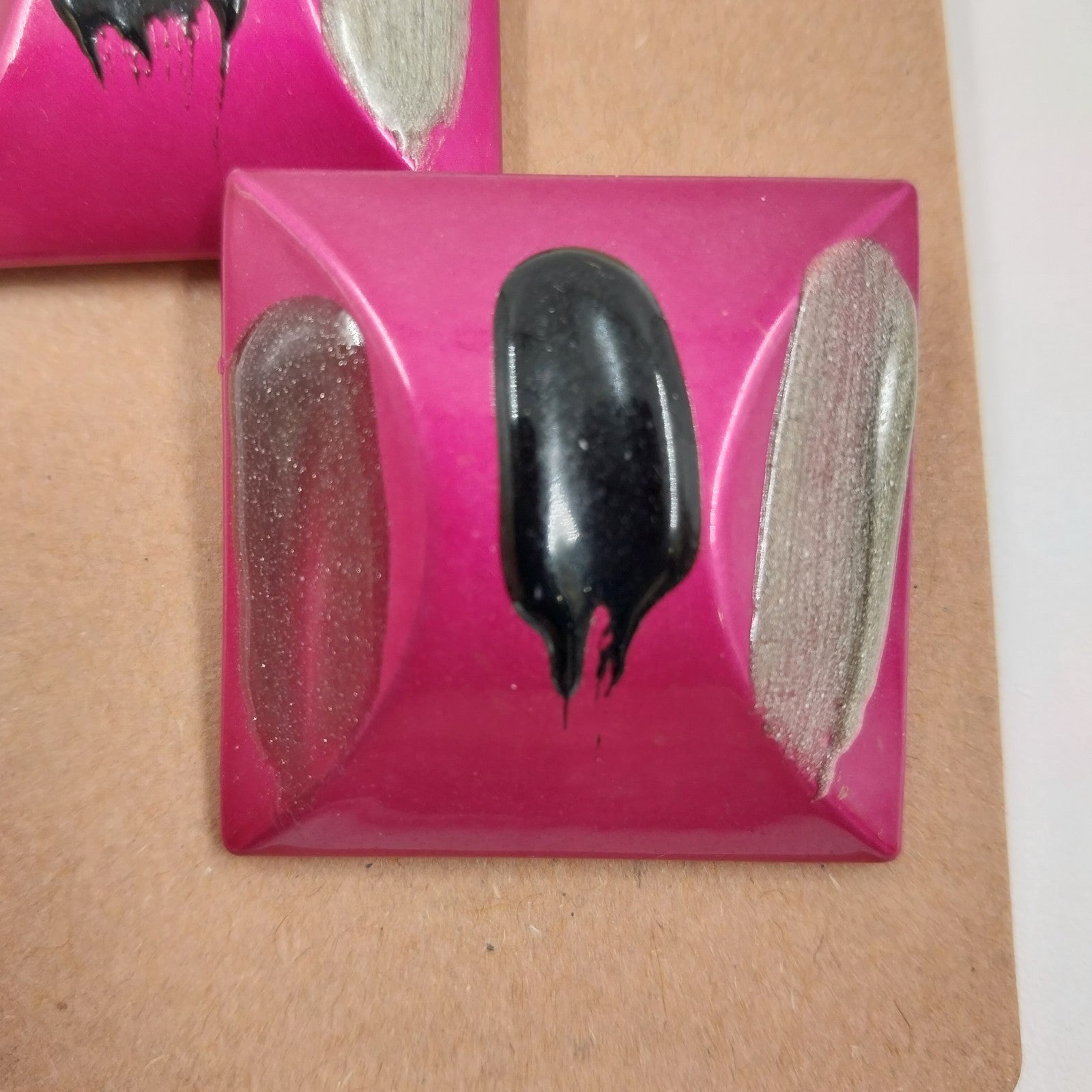 Earrings in Large Square Shiny Magenta with Gray Black Enameled 1.25" Push Back