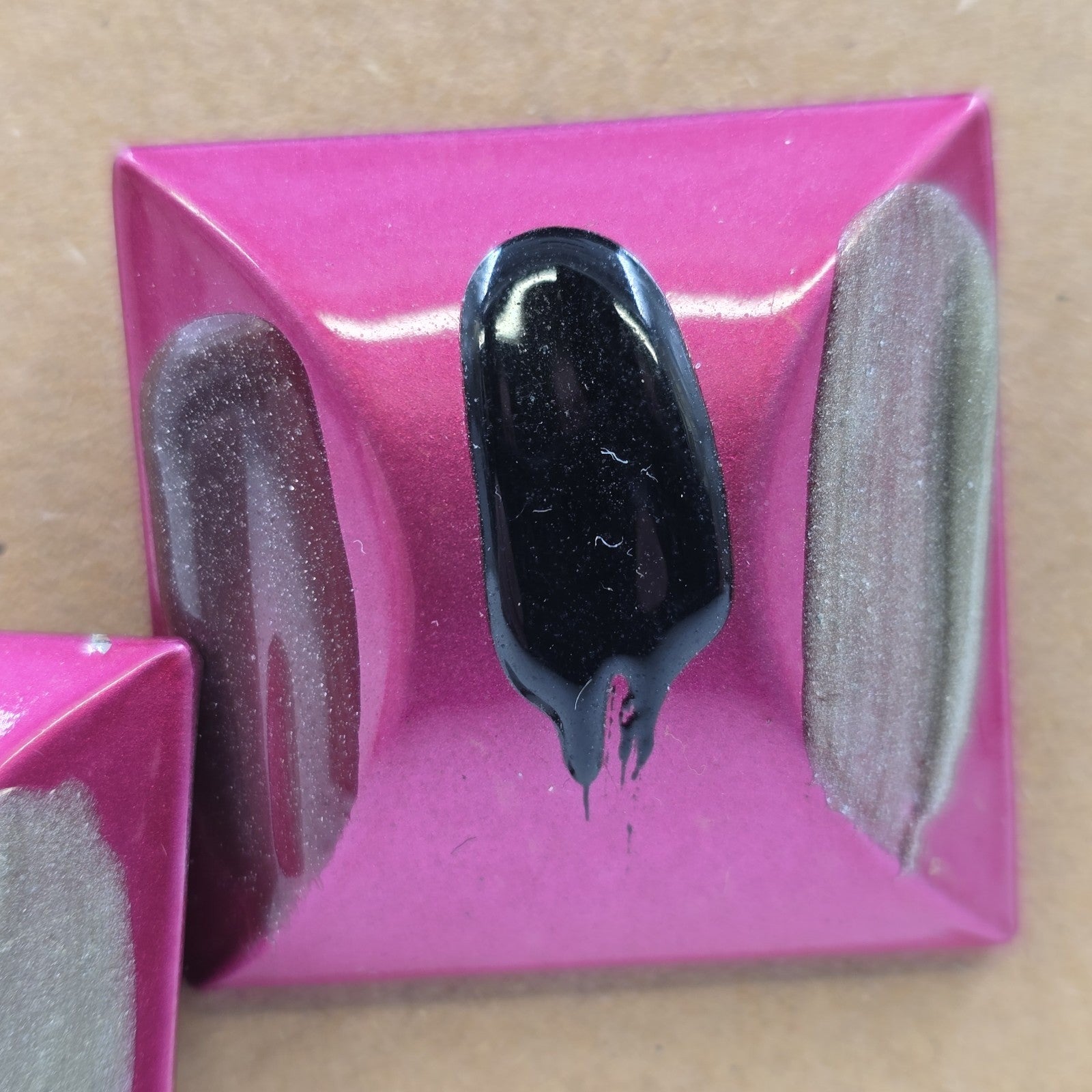 Design: Large square shape in shiny magenta, accented with gray and black enamel details.