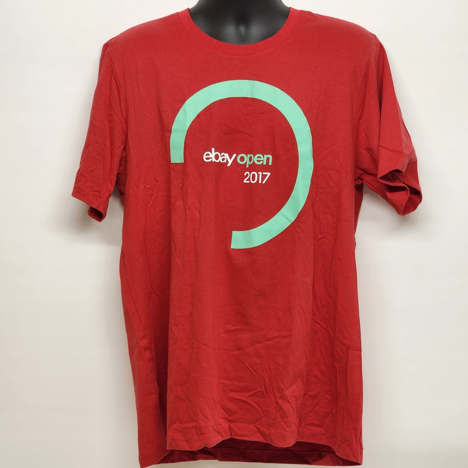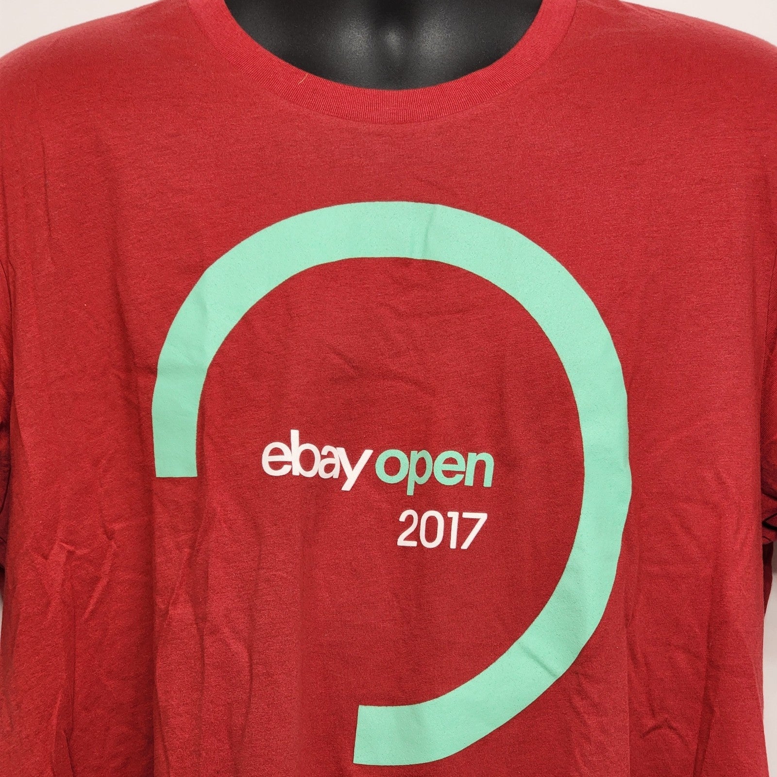 This is a dark red T-shirt from the eBay Open 2017 collection in size XL for unisex adults. Made of 100% cotton knit fabric, it features graphics with the eBay character. The shirt has a crew neck and short sleeves, making it suitable for all seasons. It is lightweight, easy to care for, and part of a limited edition run. The brand is Bella + Canvas, manufactured in the United States.