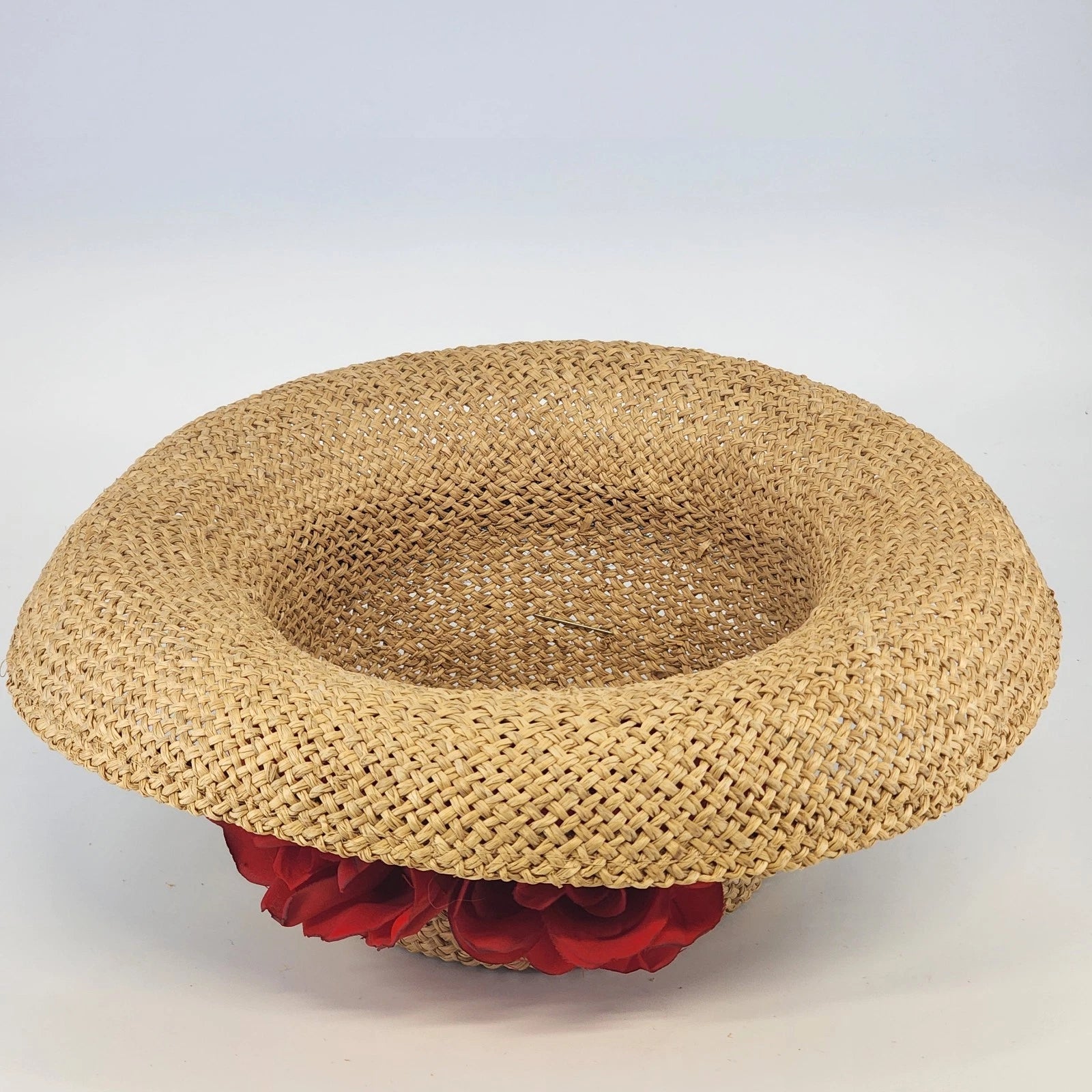 Eric Javits Luxury Squishee Sun Hat Beige Packable Woven Rose Brim Hatpin Vtg
