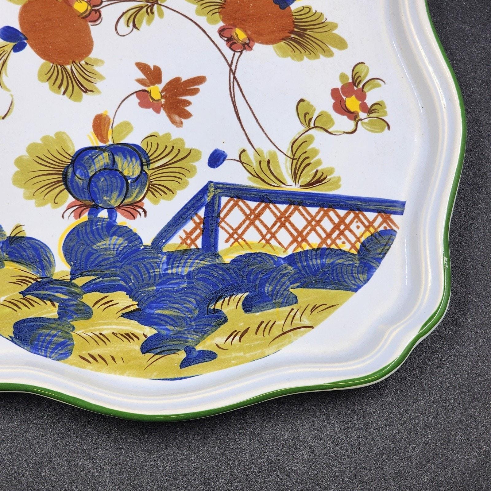Beautiful vintage ceramic dish made in Faenza, Italy, a region famous for its traditional majolica ceramics. Features the classic Garofano (Carnation) floral pattern with vibrant hand-painted details and a green trim.